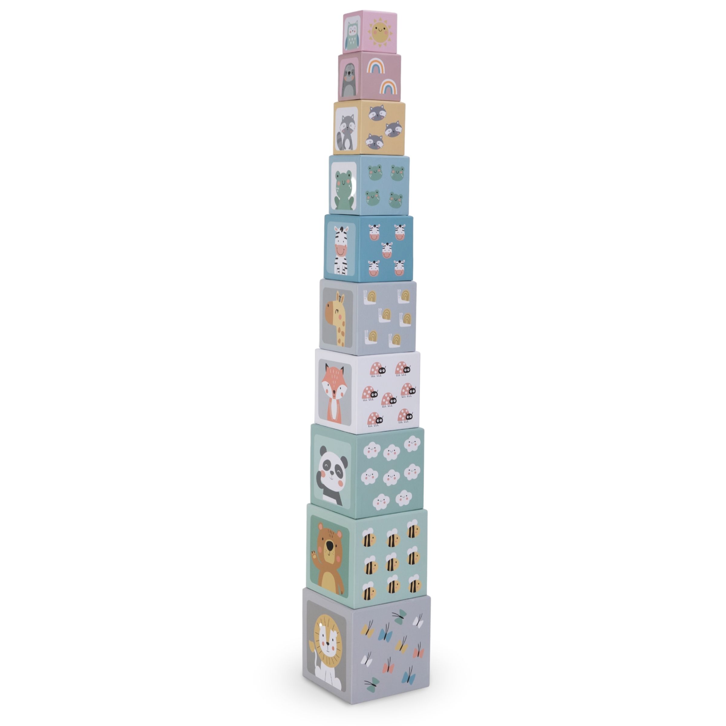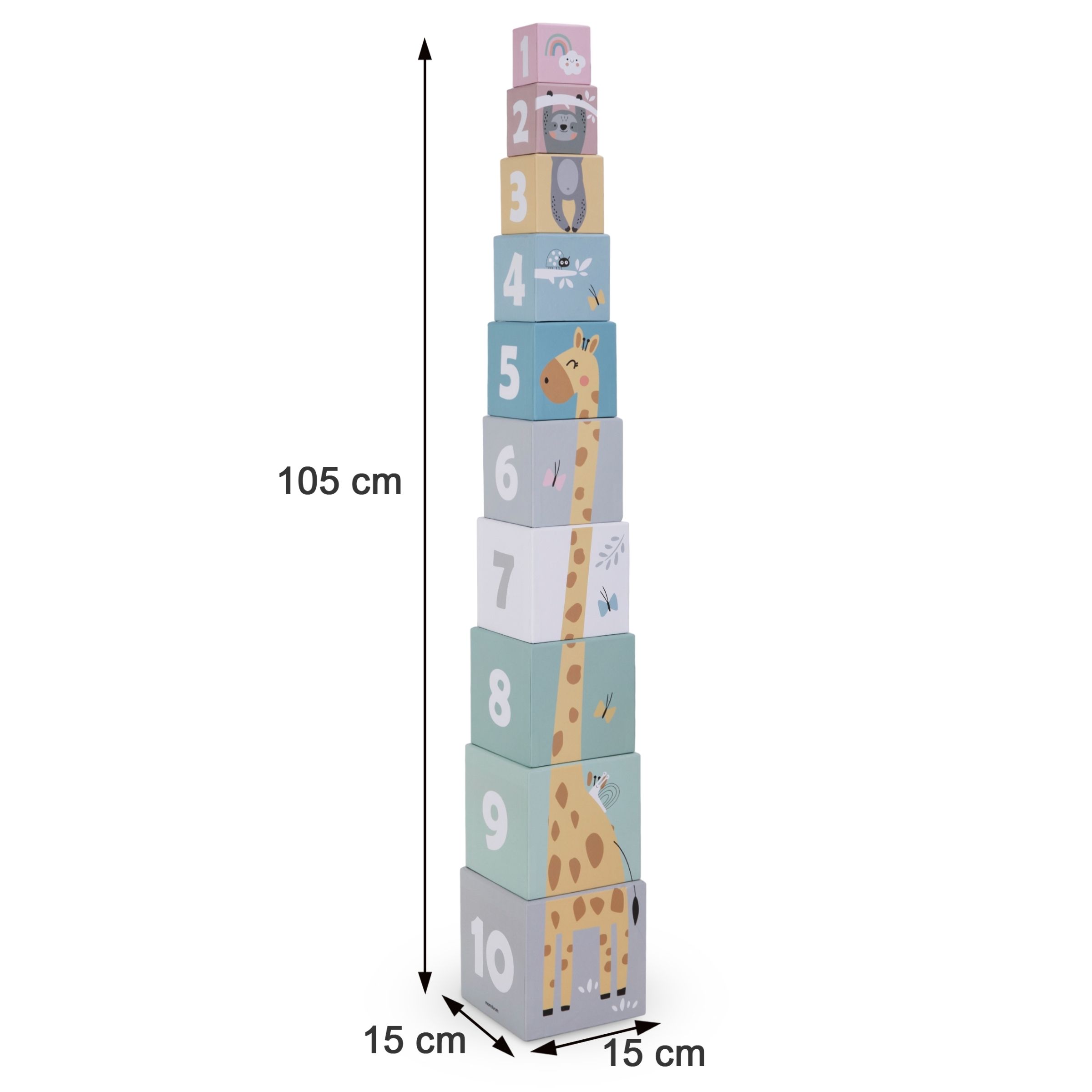 Uma torre empilhável para crianças é um brinquedo que cresce com elas. Os blocos de papelão não são apenas divertidos, mas também apoiam o desenvolvimento das crianças. Eles facilitam o aprendizado de números e tamanhos, bem como a contagem . Graças a eles, a criança amplia seu vocabulário sobre os animais e aprende a descrevê-los e reconhecê-los. O brinquedo estimula a imaginação das crianças e permite praticar a concentração. Desenvolve a capacidade de pensar logicamente . Enquanto brinca, seu filho melhora suas habilidades motoras, coordenação motora e precisão de movimentos.