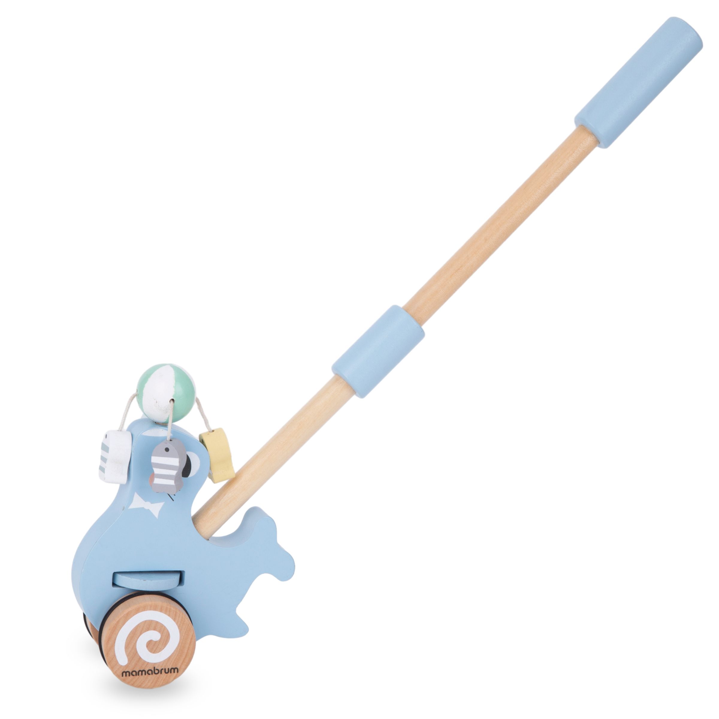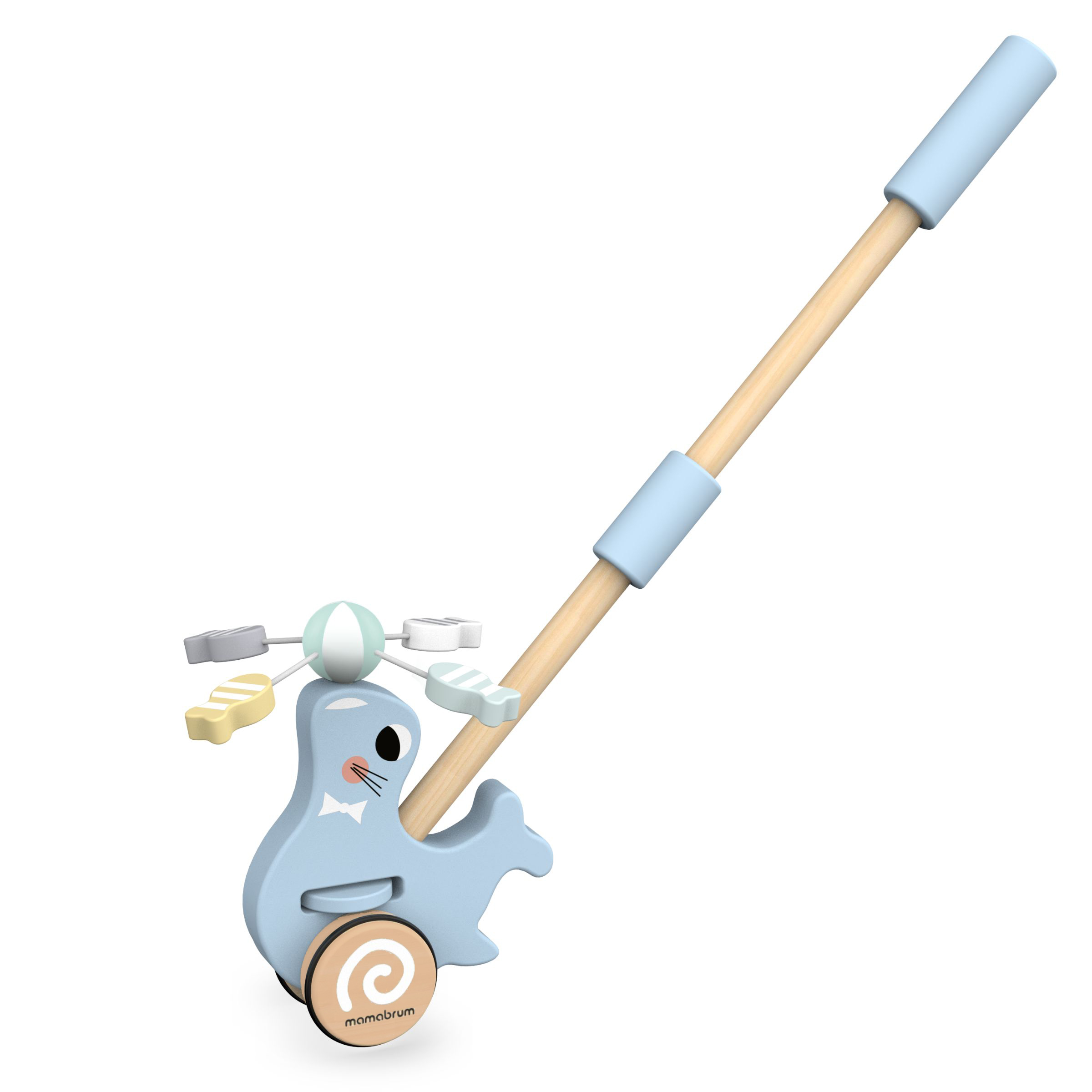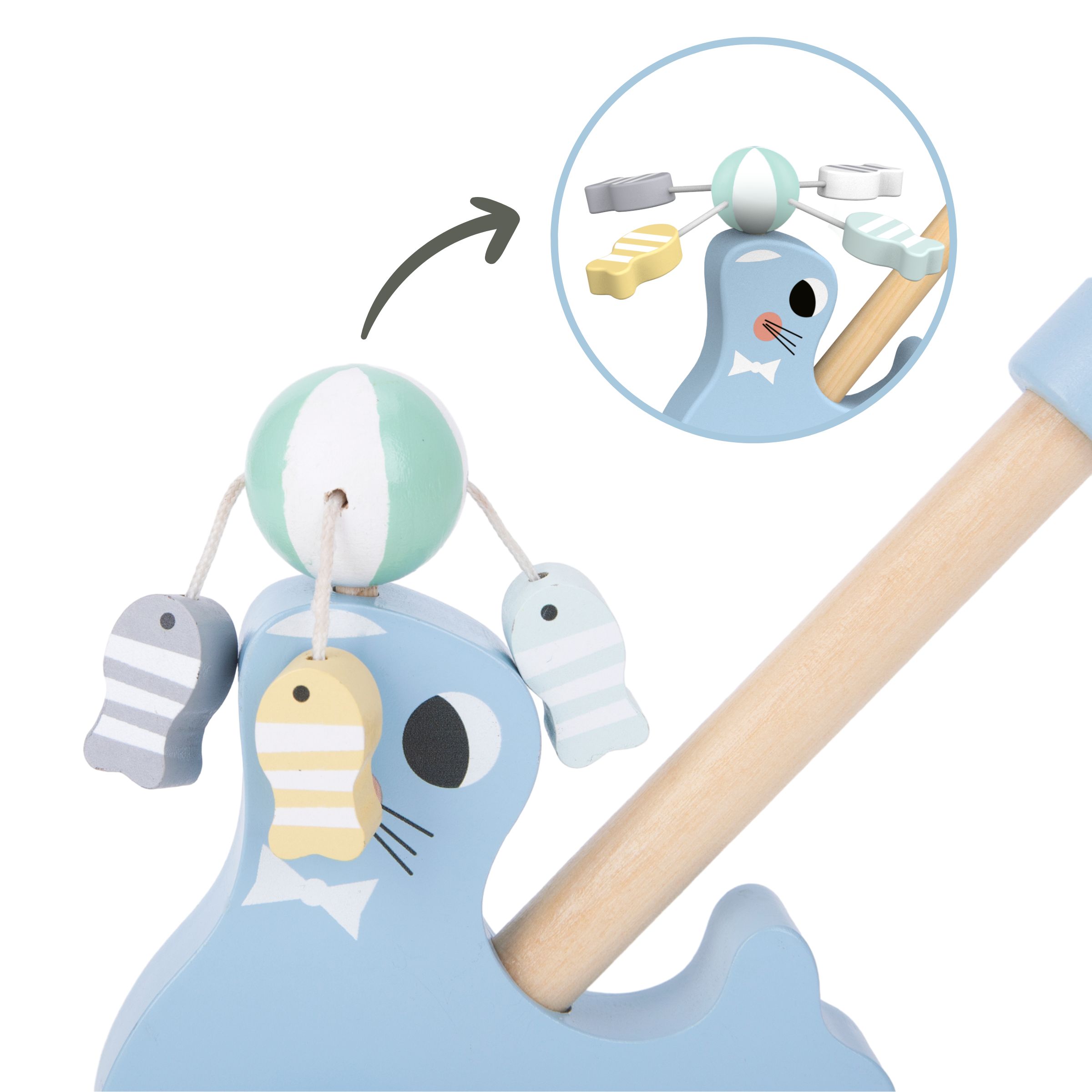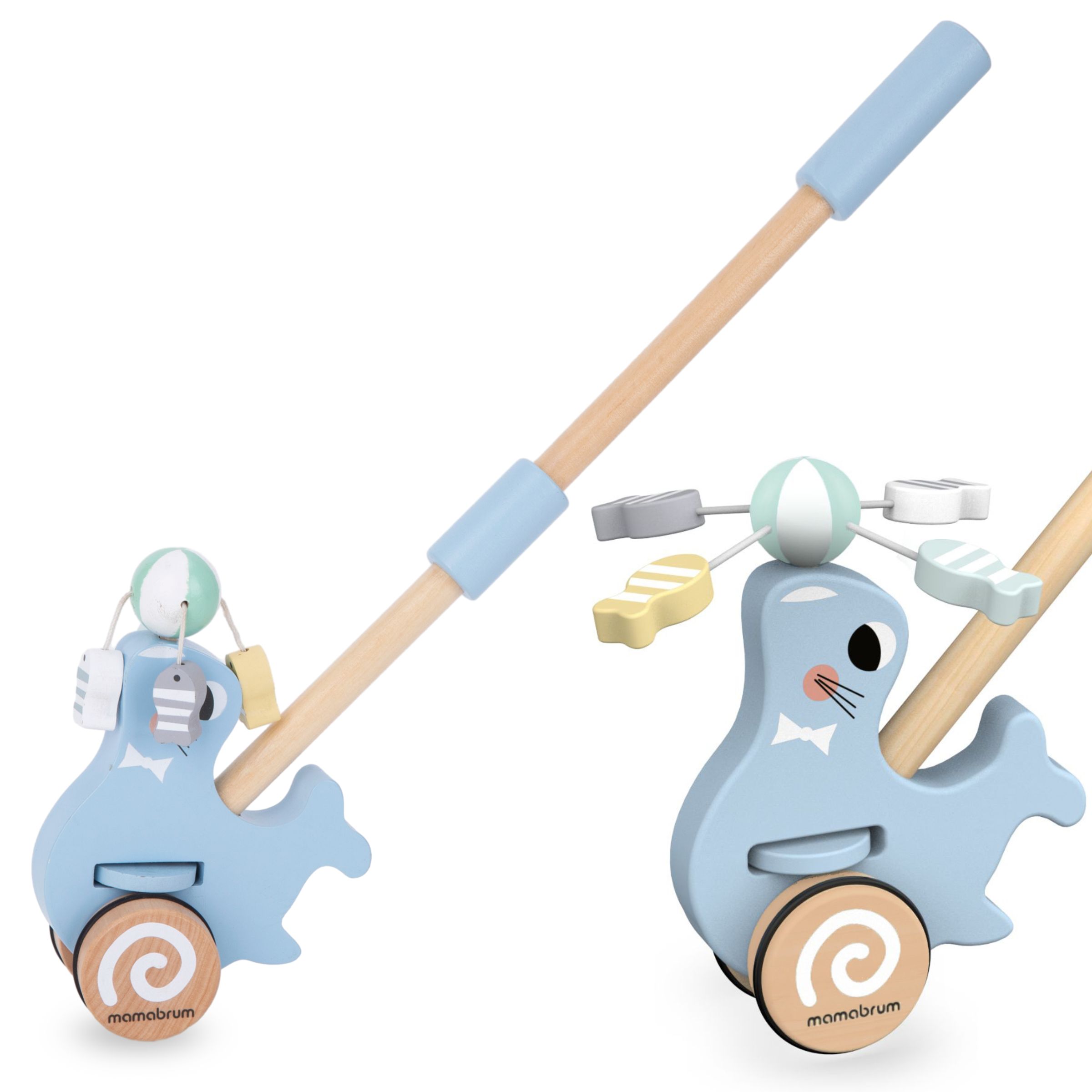 Além disso, a visão de uma foca engraçada melhorará instantaneamente o humor do seu filho, estimulará sua imaginação e o incentivará a ser ativo. O empurrador de madeira está disponível em um delicado tom azul .