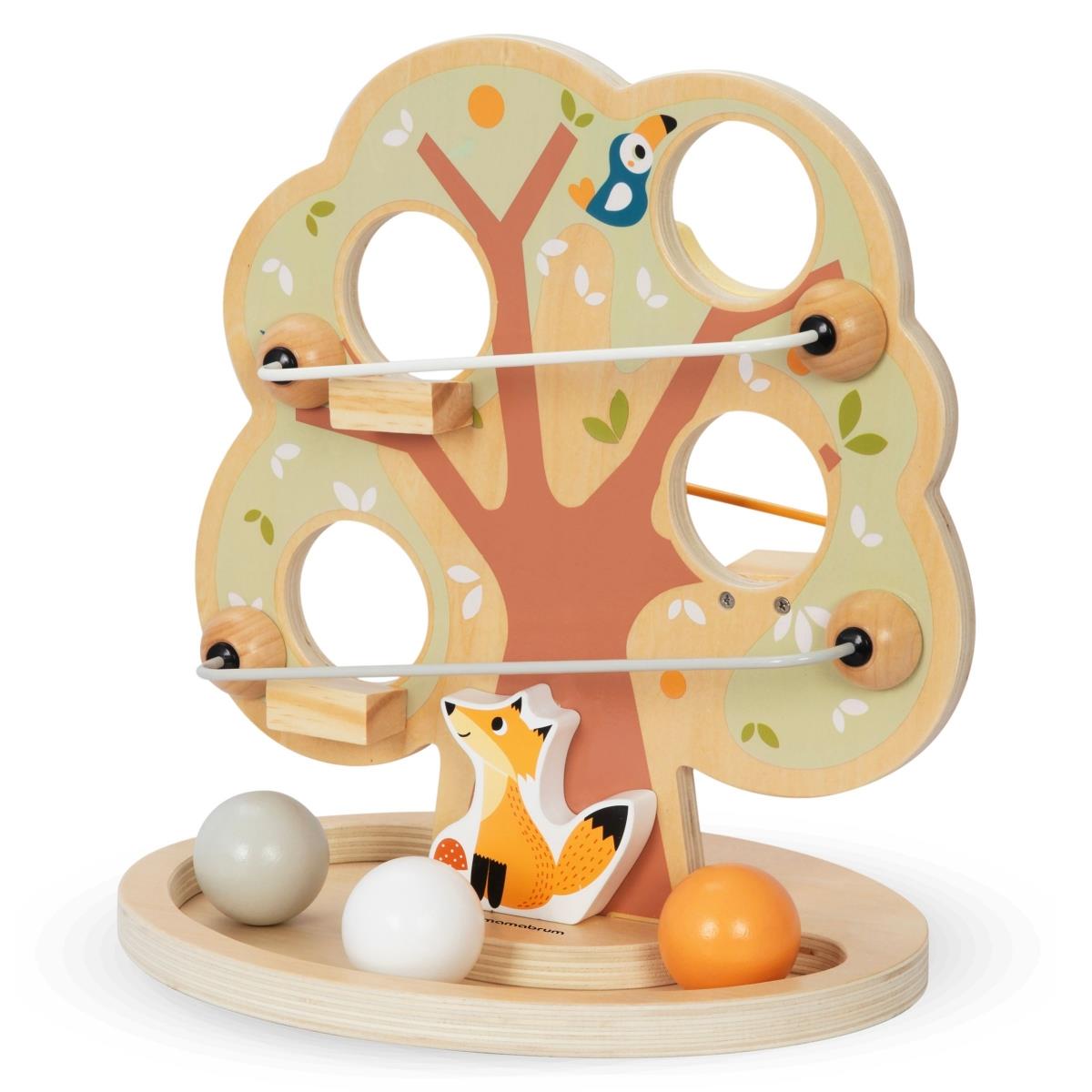 O escorrega de madeira com a forma de uma árvore verde favorece o desenvolvimento da imaginação espacial das crianças. O bebé pode exercitar a sua perceção, bem como a sua destreza manual e a coordenação olho-mão. O brinquedo apoia o desenvolvimento das crianças, moldando as suas capacidades de raciocínio lógico, reforçando a sua independência e auto-confiança. Graças ao seu design encantador, atrai eficazmente a atenção dos mais pequenos. Este facto é complementado pela adorável raposa, que se senta na base da árvore e observa o movimento das bolas.