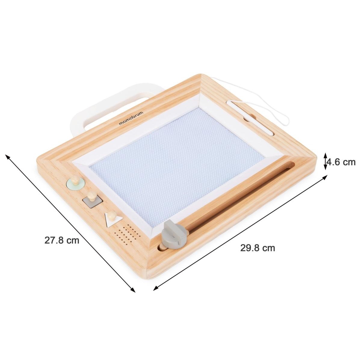 O marcador magnético permitirá que as crianças criem desenhos infinitos, criativos e multicoloridos! Basta arrastar o botão de madeira para apagar a imagem anterior e começar a desenhar novamente. O notebook está equipado com uma alça prática que facilita o transporte. A diversão é diversificada por carimbos em diversos formatos. A caneta de desenho é presa ao quadro com um barbante, para que seu filho não a perca.