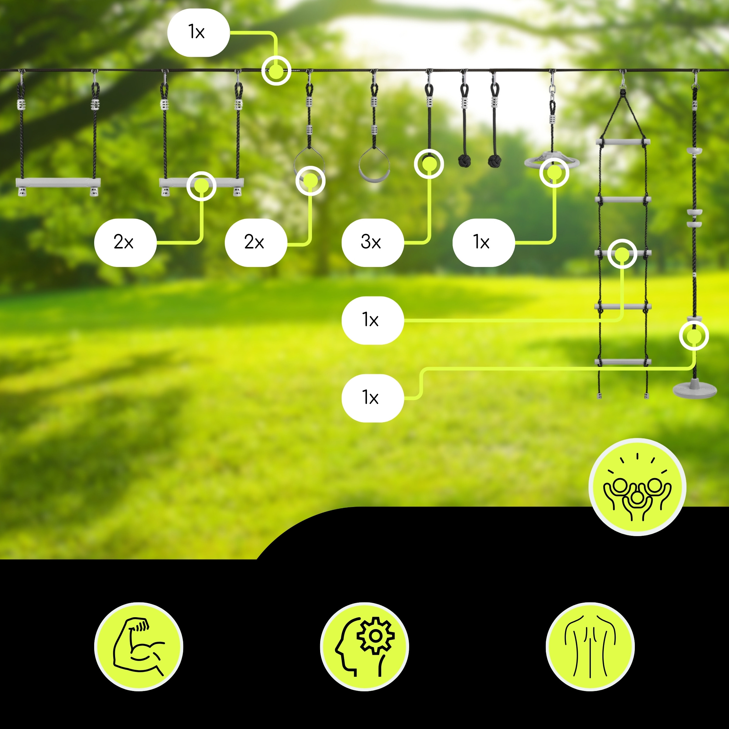 Este conjunto transformará o seu jardim num centro de diversão para as crianças. Basta colocar os seus elementos nos sítios certos para que os mais pequenos se divirtam de forma envolvente e emocionante. Pendure a corda entre as árvores e coloque nela os obstáculos incluídos no conjunto. Ultrapassá-los proporcionará às crianças uma experiência inesquecível, bem como uma boa dose de exercício.