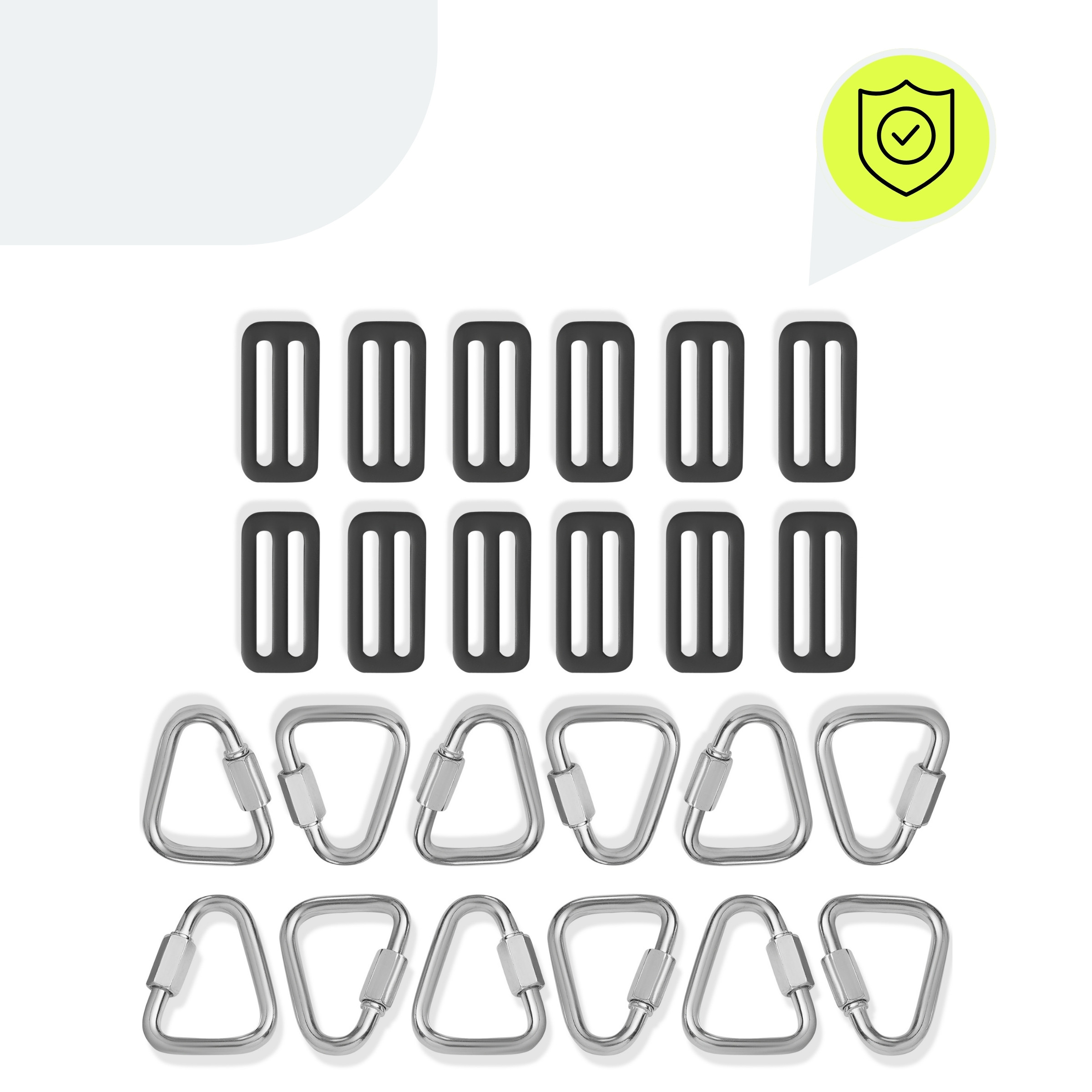 A pista de obstáculos Ninja para crianças é uma escolha segura. Todos os seus componentes foram adaptados para utilização no exterior. Foram utilizados fios resistentes aos raios UV para aumentar a durabilidade das correias, tornando-as menos susceptíveis de se rasgarem. O tensor foi revestido com zinco amarelo, o que significa uma proteção eficaz contra a corrosão e garante uma utilização prolongada. Os componentes de aço do kit distinguem-se pela sua durabilidade excecional.
