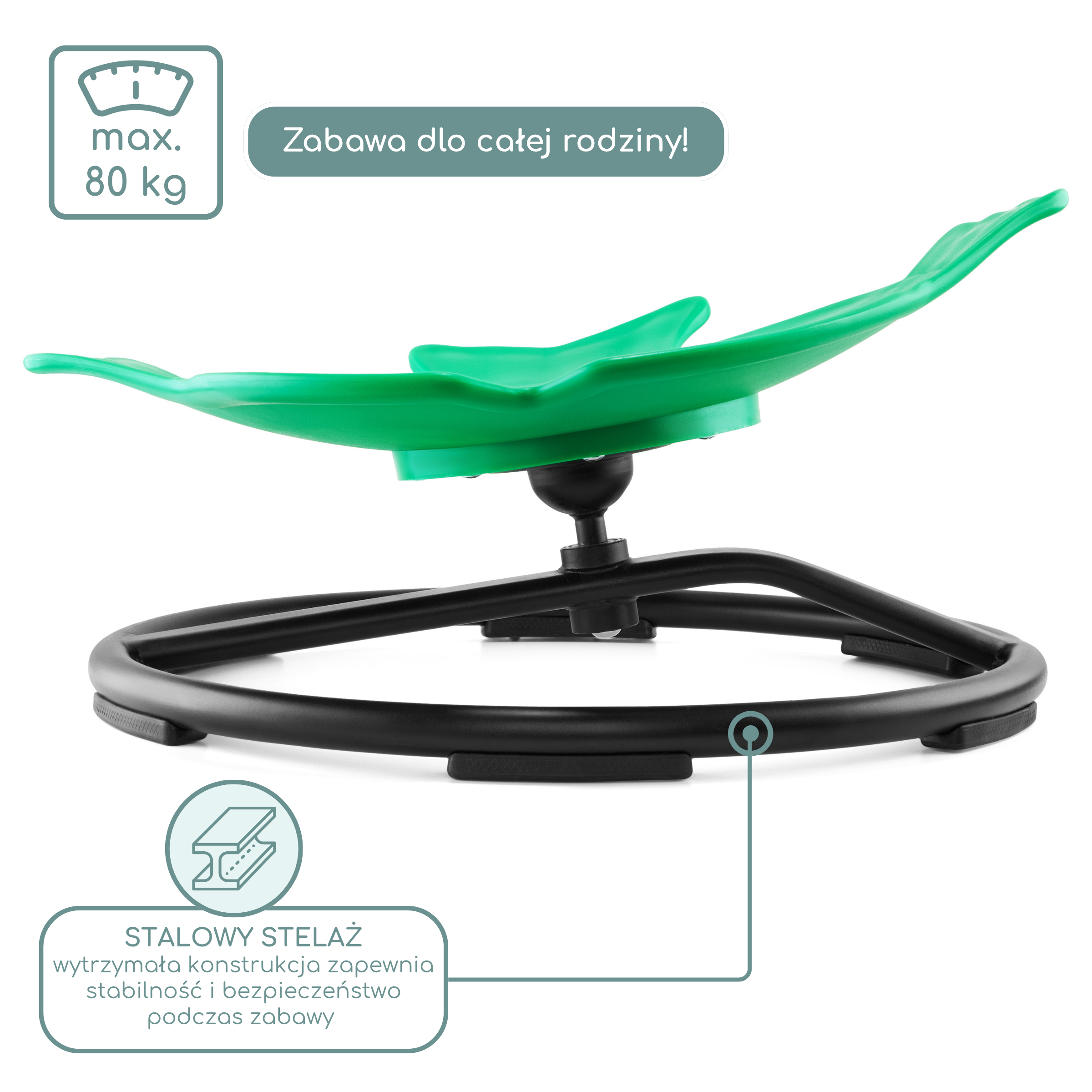 Os rebordos espessos do assento permitem que as crianças se agarrem com firmeza, aumentando assim a sua segurança durante a brincadeira. A estrutura metálica confere estabilidade e robustez à estrutura, e as bases de borracha evitam que o mini carrossel deslize no chão. Fabricado em plástico, o assento foi devidamente contornado para garantir que as crianças ficam numa posição confortável e estável enquanto giram.