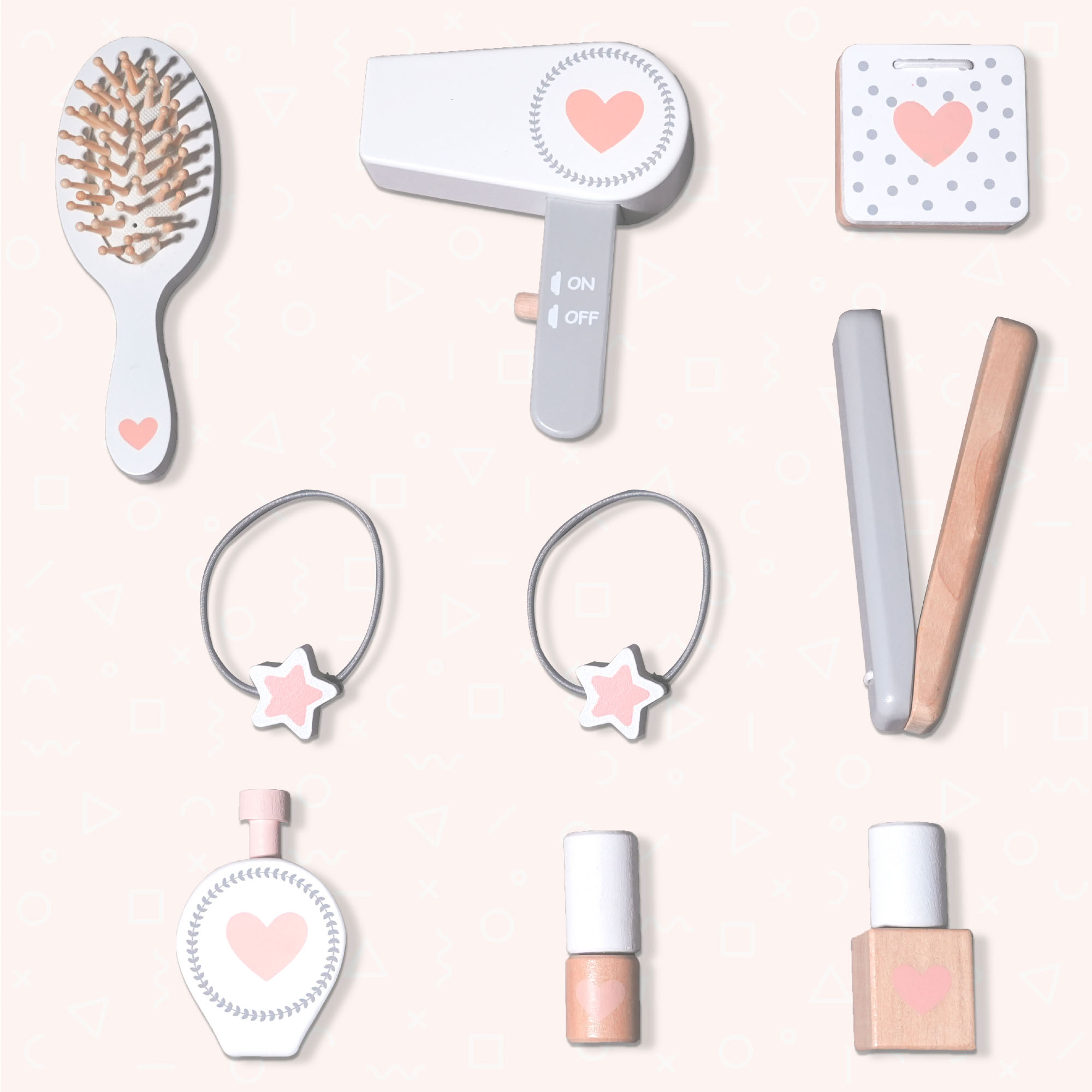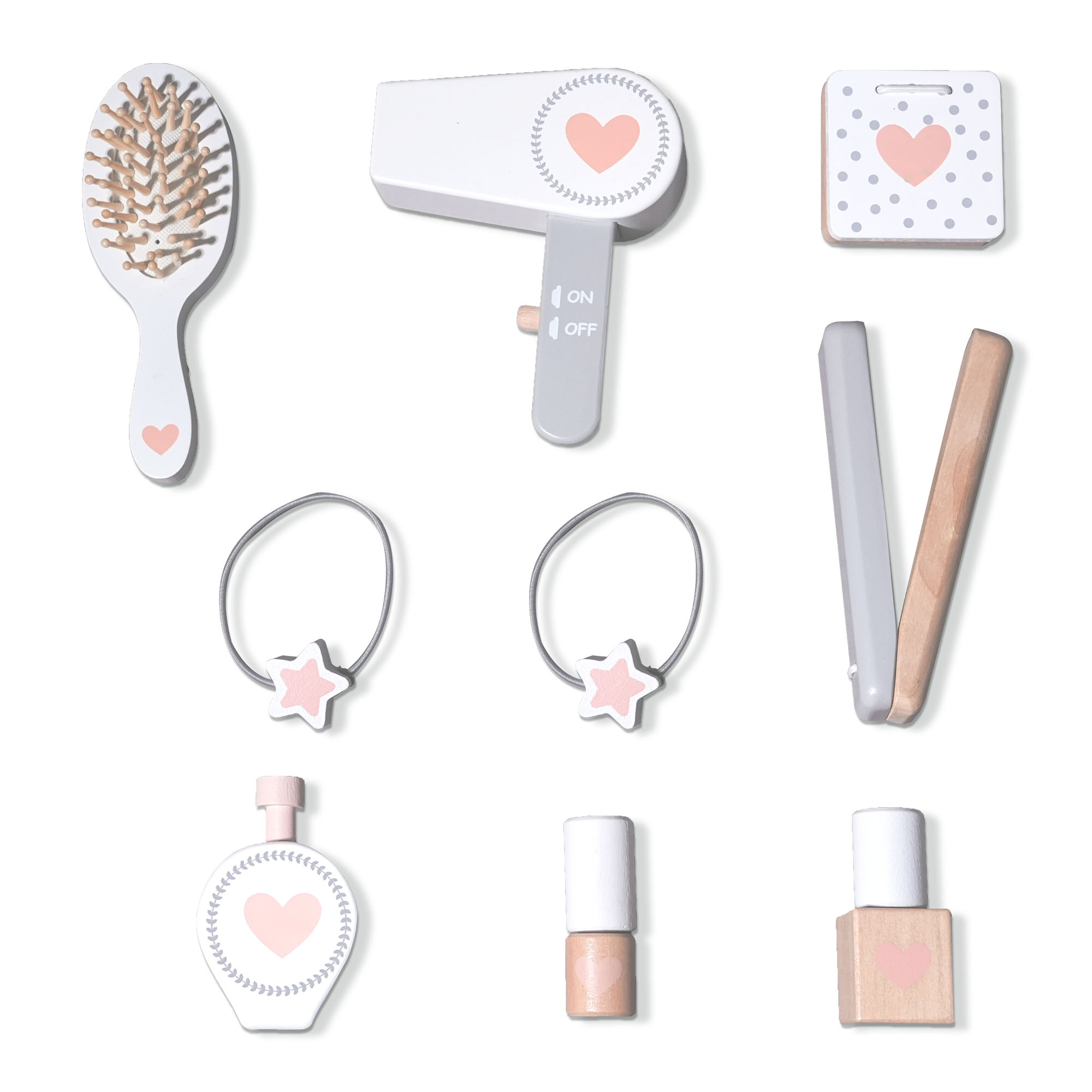 - Até 9 acessórios incluídos: escova de cabelo, secador de cabelo, sombra de olhos, 2 elásticos, alisador de cabelo, perfume, verniz de unhas, batom