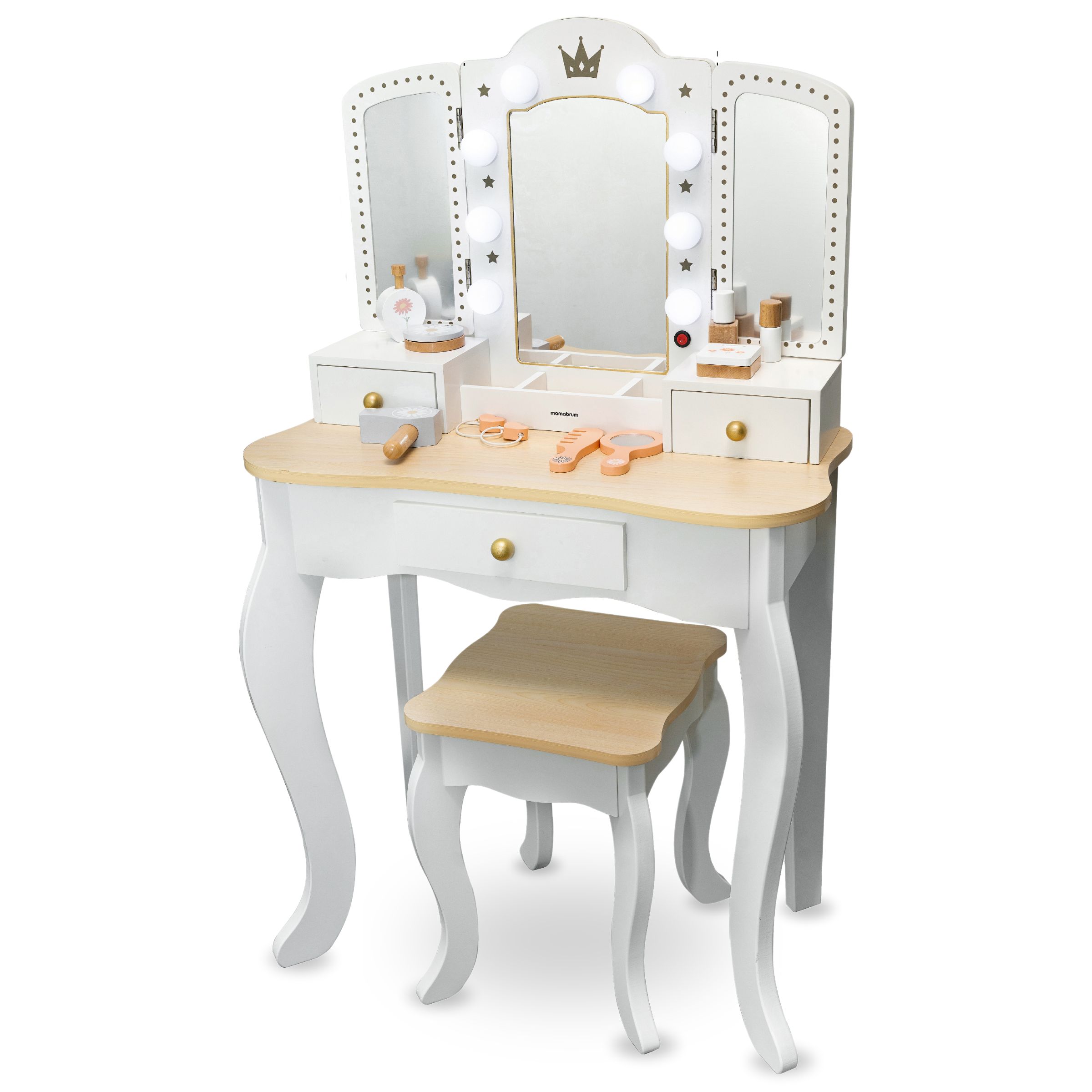 A iluminação atmosférica e suave é assegurada por 8 lâmpadas LED. O espelho pode ser retirado, transformando o toucador numa pequena secretária. Para ver o seu rosto de um ângulo diferente, basta ajustar os espelhos laterais. O toucador de madeira é uma ideia única de presente para o seu filho!