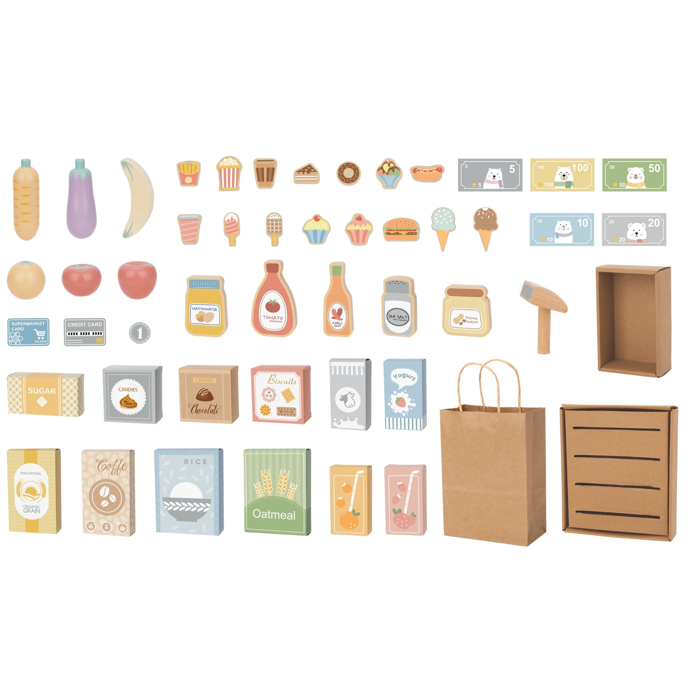 Numerosas prateleiras para expor as mercadorias permitem ao pequeno comerciante classificar os produtos e organizá-los de forma cómoda. Graças ao suporte robusto e ao vasto equipamento da banca de madeira, o seu filho pode assumir o papel de lojista ou de cliente e proporcionar um entretenimento único e criativo.