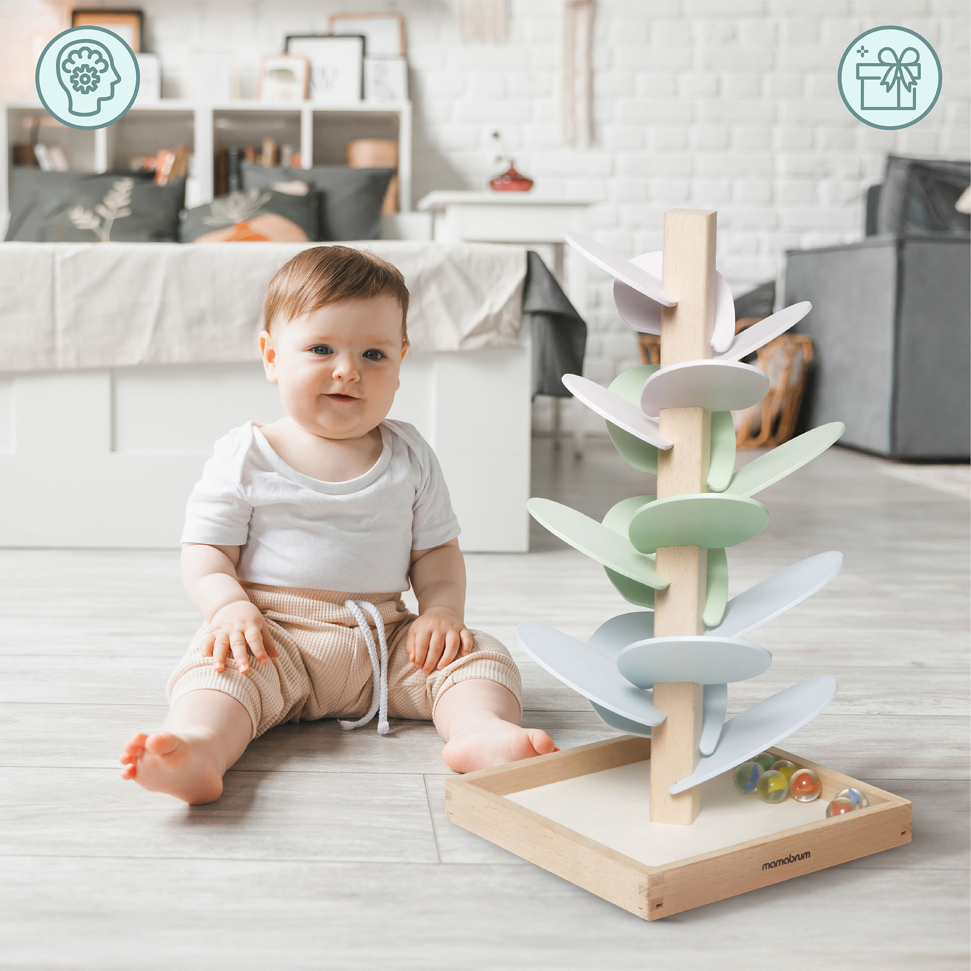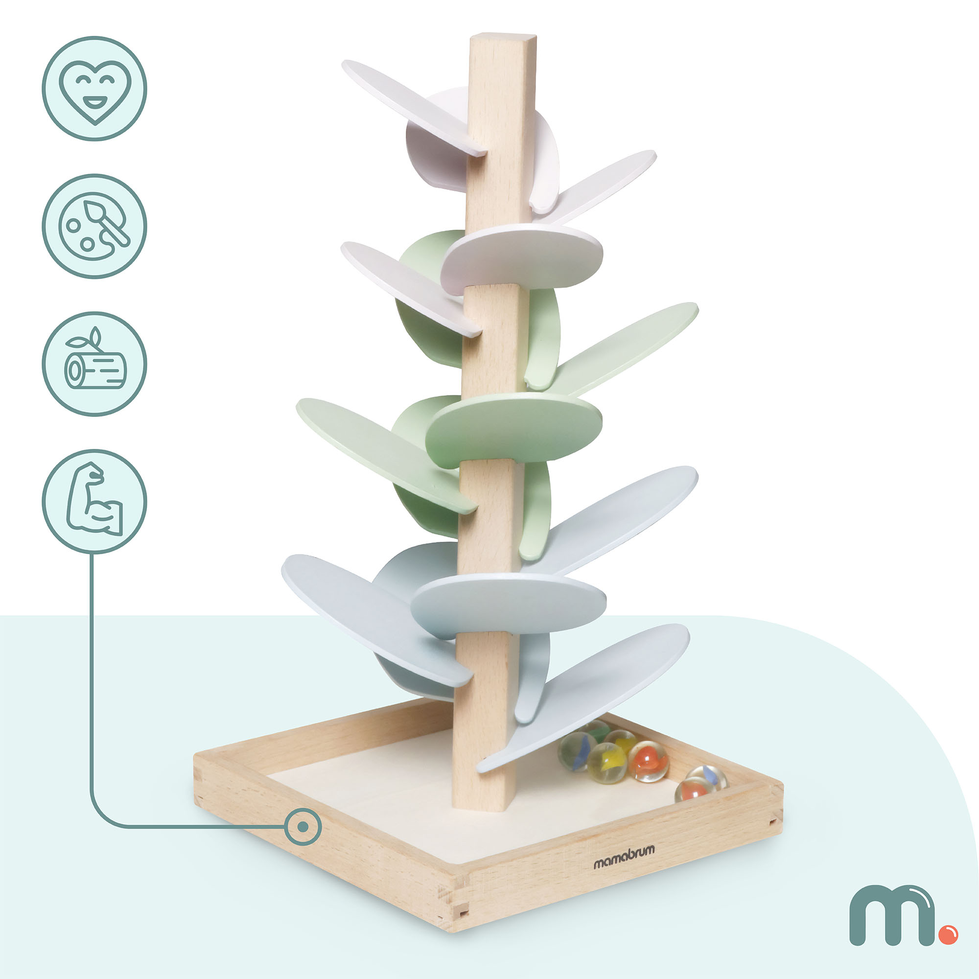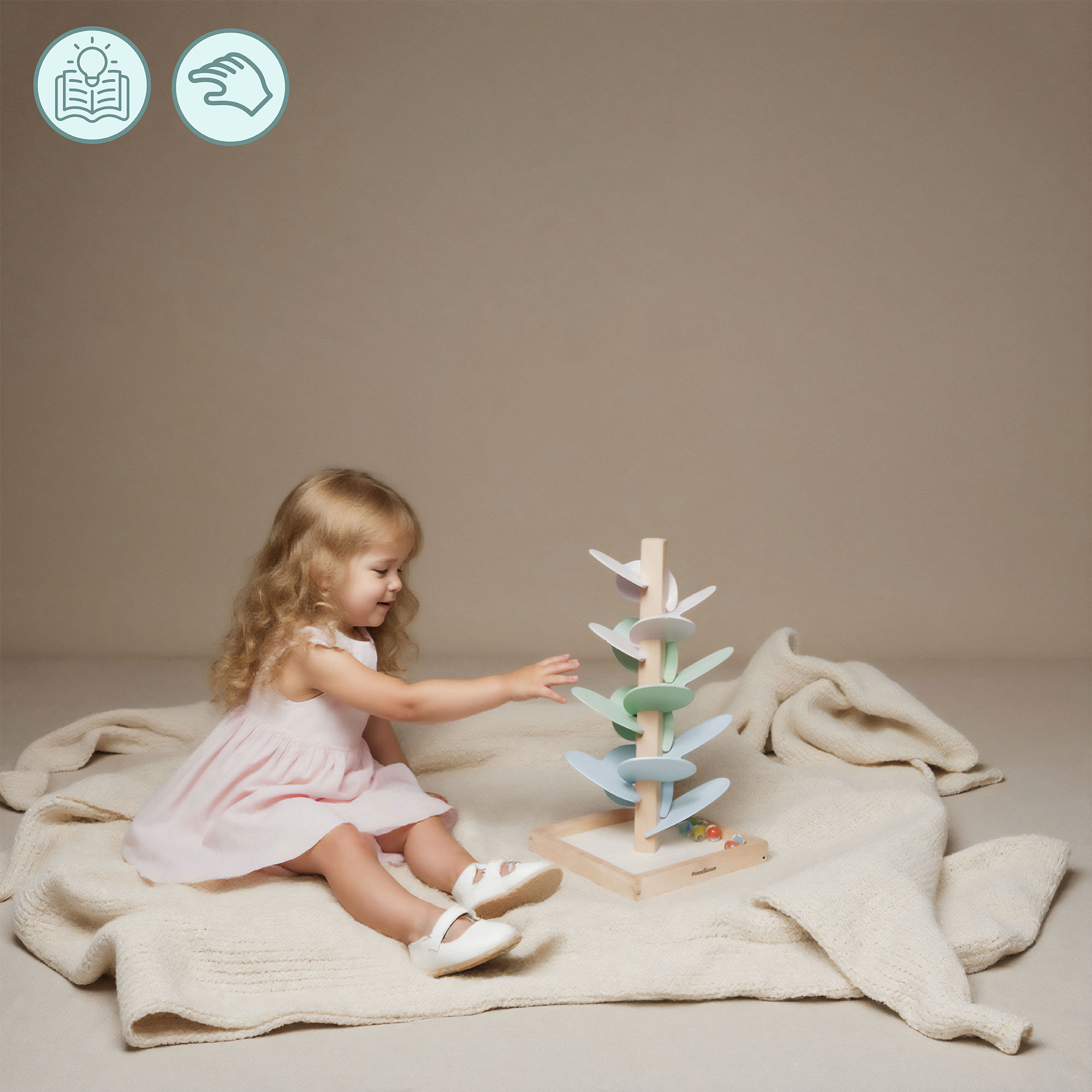 A árvore de madeira tornar-se-á uma decoração única para o quarto de uma criança, trazendo paz e um toque de magia ao quarto. As folhas em tons pastel deliciam-se com a sua suavidade, enquanto as bolas transparentes com um centro colorido dão um efeito visual único ao conjunto. O brinquedo ensina a paciência, a concentração e a coordenação, ao mesmo tempo que tem um efeito calmante para promover a tranquilidade da criança. É o presente ideal que combina desenvolvimento com brincadeiras criativas e divertidas.