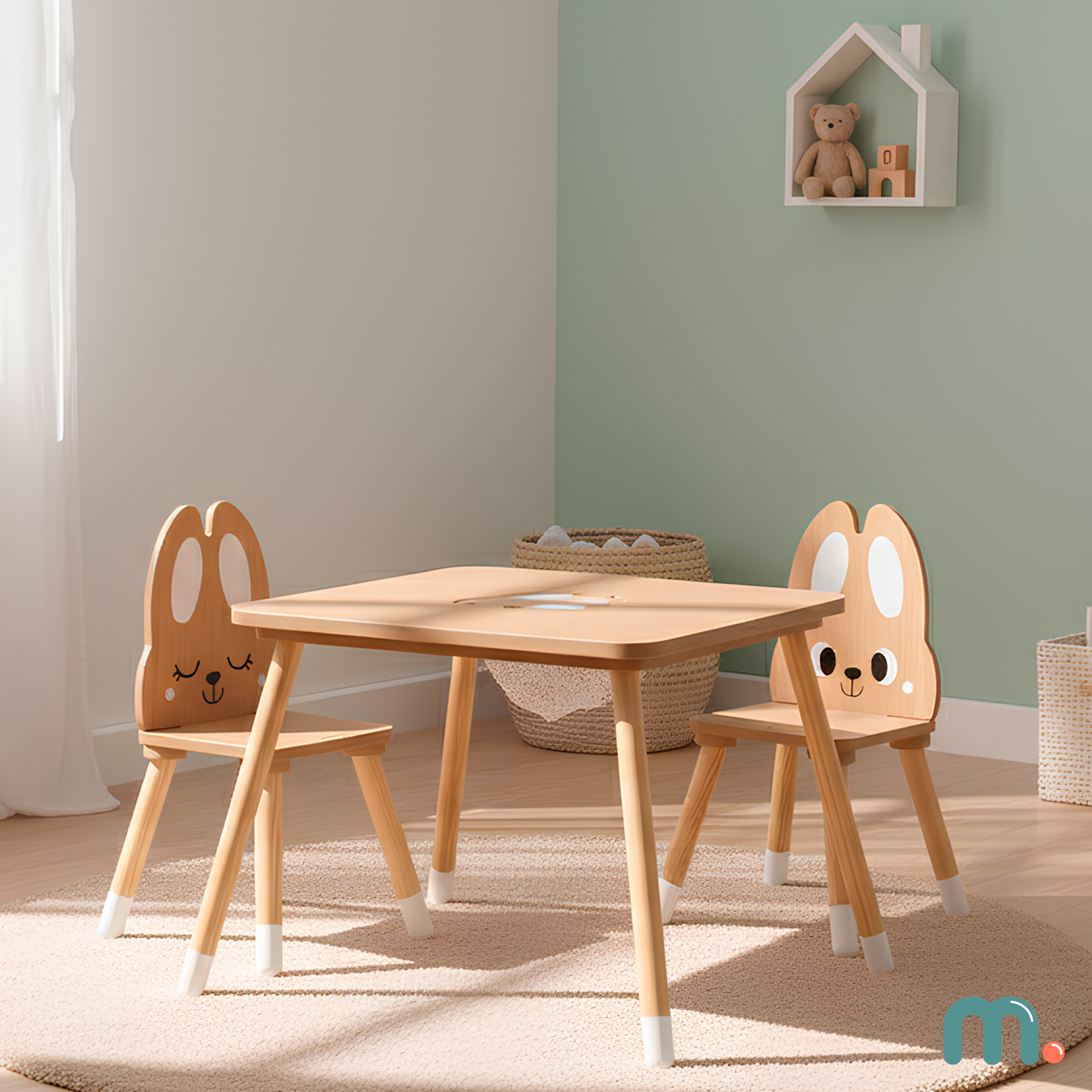 Mesa de madeira com arrumação e 2 cadeiras Conjunto infantil - Cute Rabbit