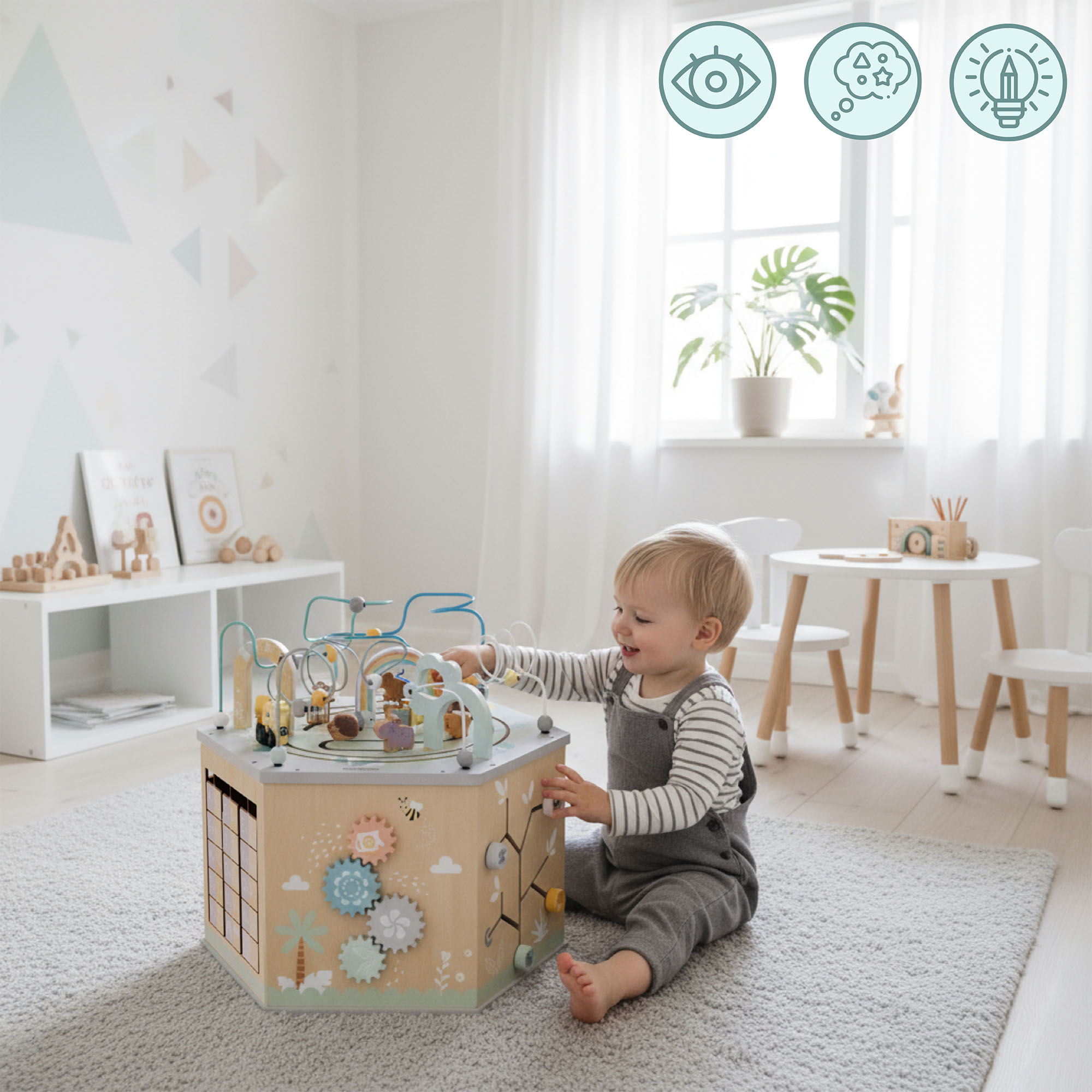 Todos os pais sonham com um momento de descanso, quando o seu pequeno está entretido a brincar e, simultaneamente, a desenvolver as suas capacidades. Este cubo de aprendizagem multifuncional foi criado a pensar nesses momentos. Graças à sua versatilidade , pode manter a criança ocupada durante horas , captando a sua atenção, estimulando a sua imaginação e permitindo-lhe praticar as suas capacidades manuais e a sua concentração. Enquanto o seu pequeno descobre novas atividades com alegria, os pais podem ter a certeza de que este tempo está a ser aproveitado de forma significativa e segura. Não é apenas um brinquedo, mas também uma ferramenta que apoia o desenvolvimento diário do seu filho e traz paz à sua vida familiar.