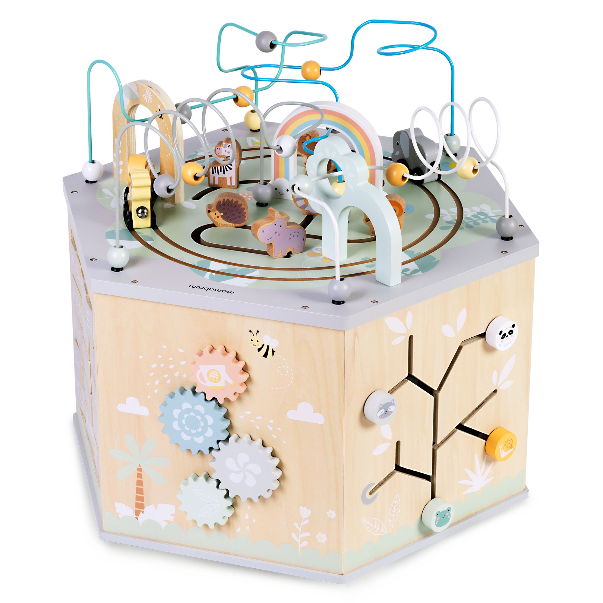 Dê ao seu filho um brinquedo que o encantará com sua diversidade e o manterá ocupado por horas! Este cubo educacional grande e multifuncional é um verdadeiro centro de atividades que apoia o desenvolvimento do seu filho por meio da brincadeira. Cada lado tem uma tarefa diferente — desde mover contas a combinar formas e girar engrenagens. Cores suaves, animais adoráveis e ilustrações simpáticas fazem do cubo não apenas um brinquedo, mas também um complemento decorativo para o quarto de uma criança .