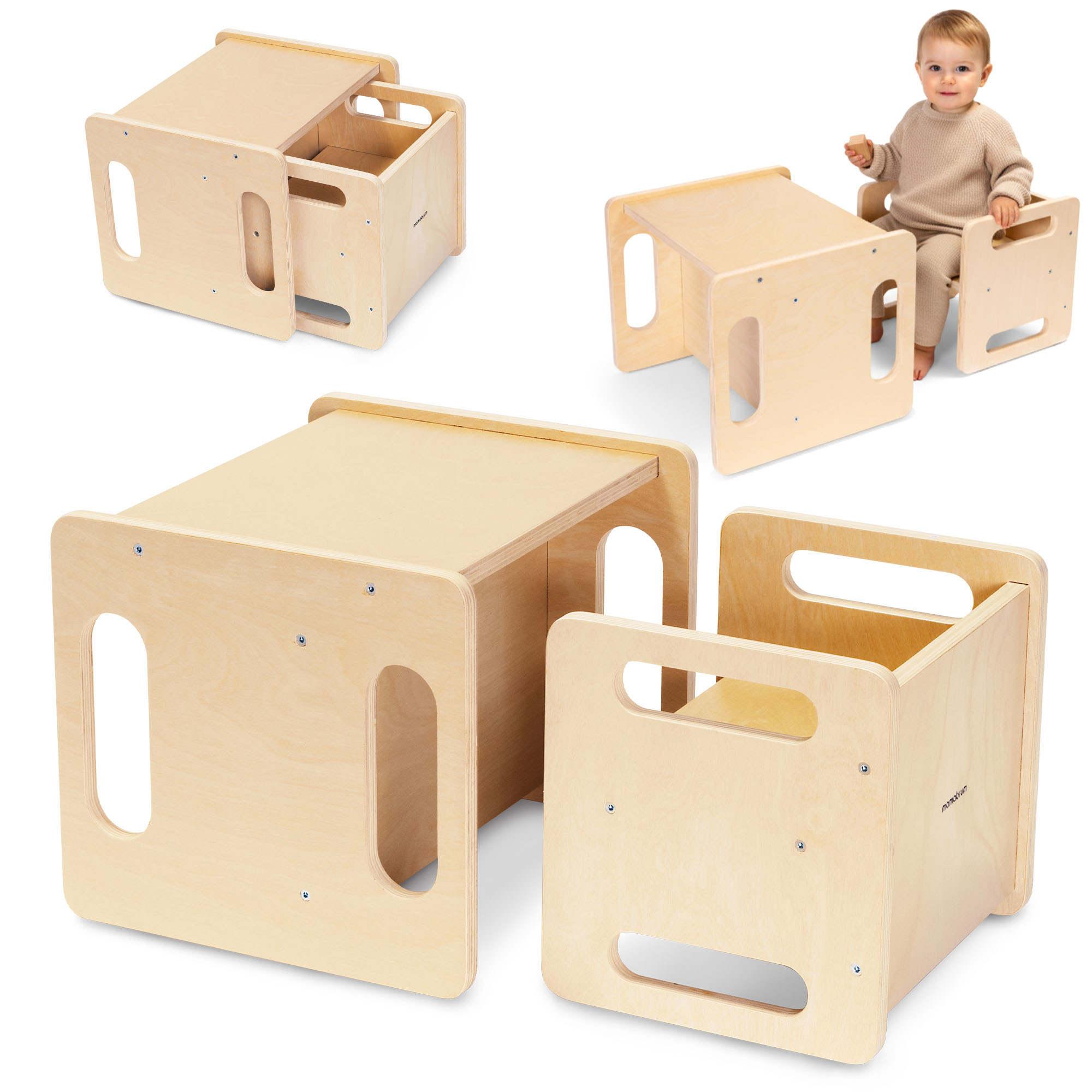 Mesa e cadeira de madeira com função de plataforma - um conjunto Montessori multifuncional para crianças