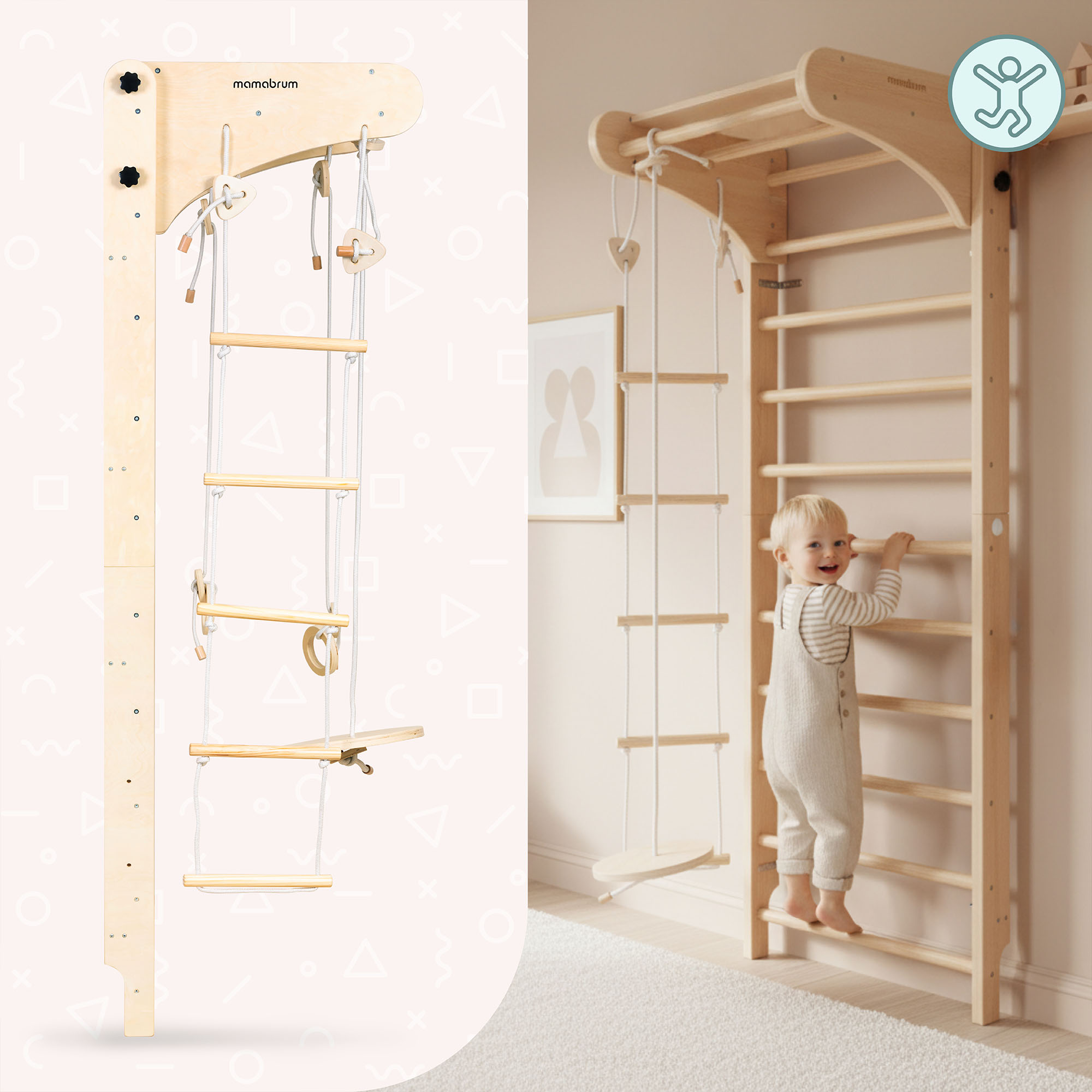Madeira natural, design minimalista e acabamento meticuloso fazem com que a escada pareça menos um equipamento esportivo e mais um elemento moderno de quarto infantil. As cores vibrantes e a forma simples combinam perfeitamente com interiores clássicos e modernos, adicionando um toque aconchegante. A escada se torna um elemento de design que não atrapalha a estética do ambiente, mas adiciona personalidade e estilo único. Esta solução combina funcionalidade com beleza – um centro de atividades para crianças e um elemento de design harmonioso para pais que se preocupam com a aparência do seu espaço.