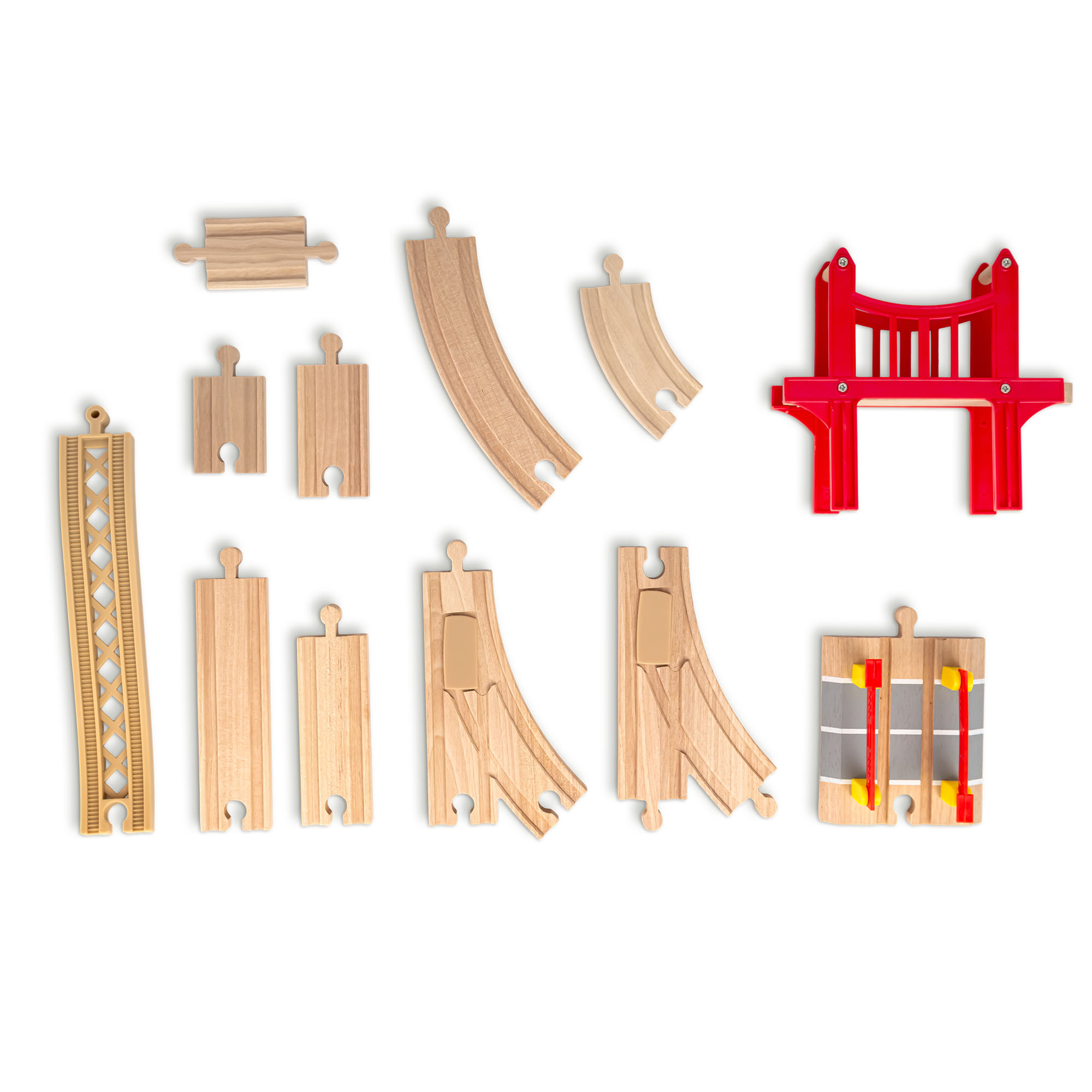 Pontes com rampas e túneis ferroviários adicionam dinamismo e personalidade a todo o conjunto. As crianças podem observar o trem entrar na ponte, atravessar o viaduto e desaparecer no túnel. Esse elemento emocionante da brincadeira torna cada passeio diferente . Além disso, pontes e túneis ajudam a desenvolver a imaginação espacial e ensinam o planejamento de rotas.