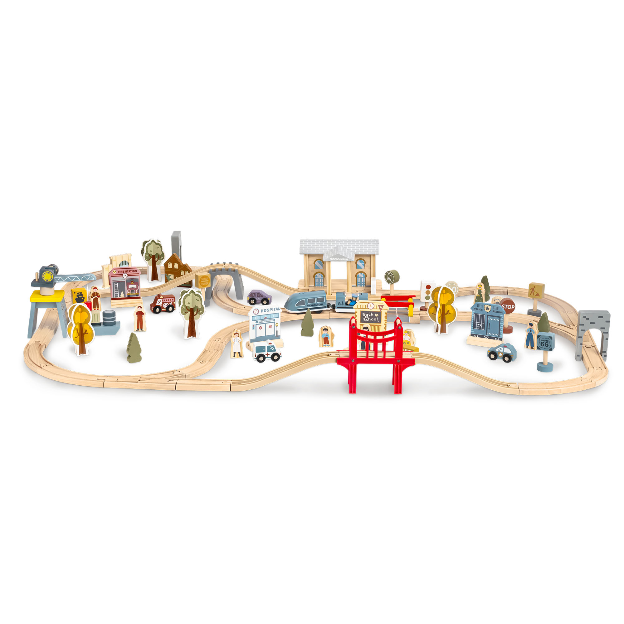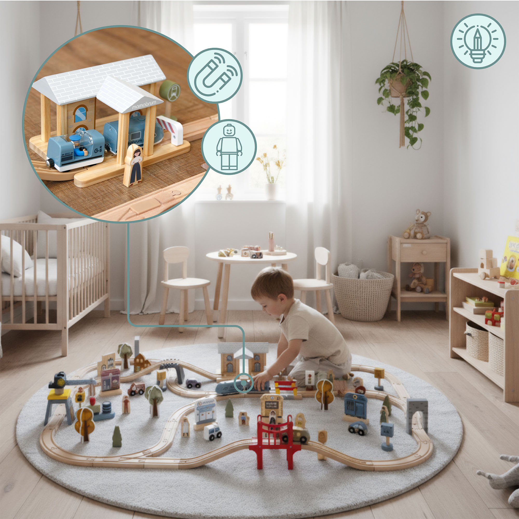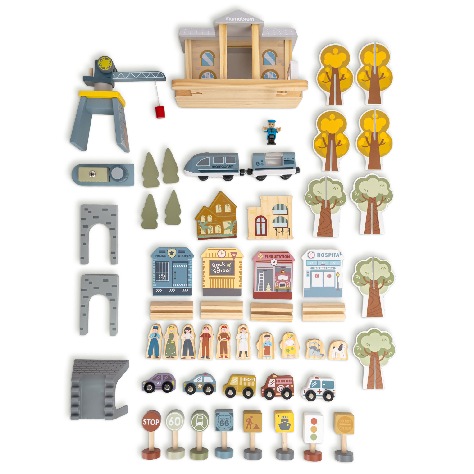 O conjunto inclui tudo o que é necessário para criar uma cidade movimentada: uma escola, um hospital, um quartel de bombeiros, uma delegacia de polícia , placas de trânsito, árvores e figuras de moradores. As crianças podem encenar cenas do dia a dia – resgatando, ensinando, patrulhando e dirigindo o trânsito. Brincar de cidade desenvolve empatia, compreensão dos papéis sociais e estimula a criatividade. Toda criança pode ser maquinista hoje e bombeiro ou médico amanhã.