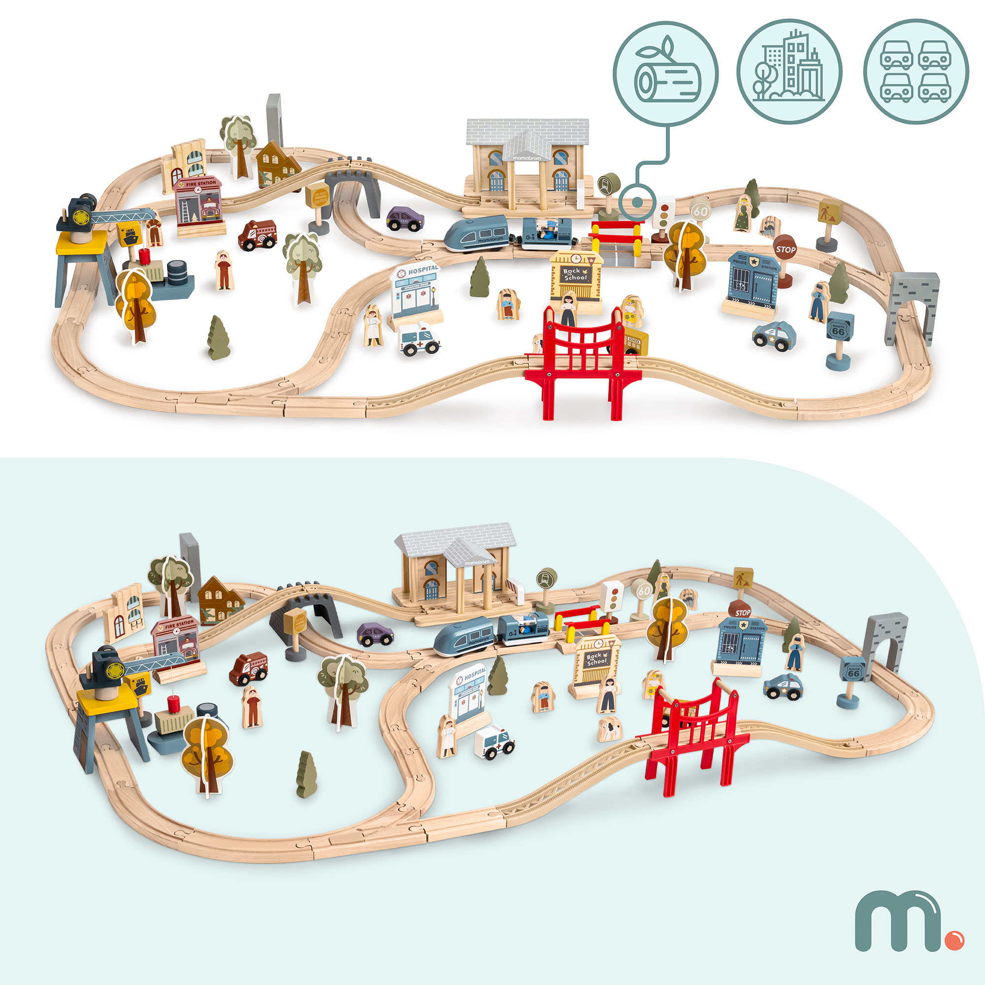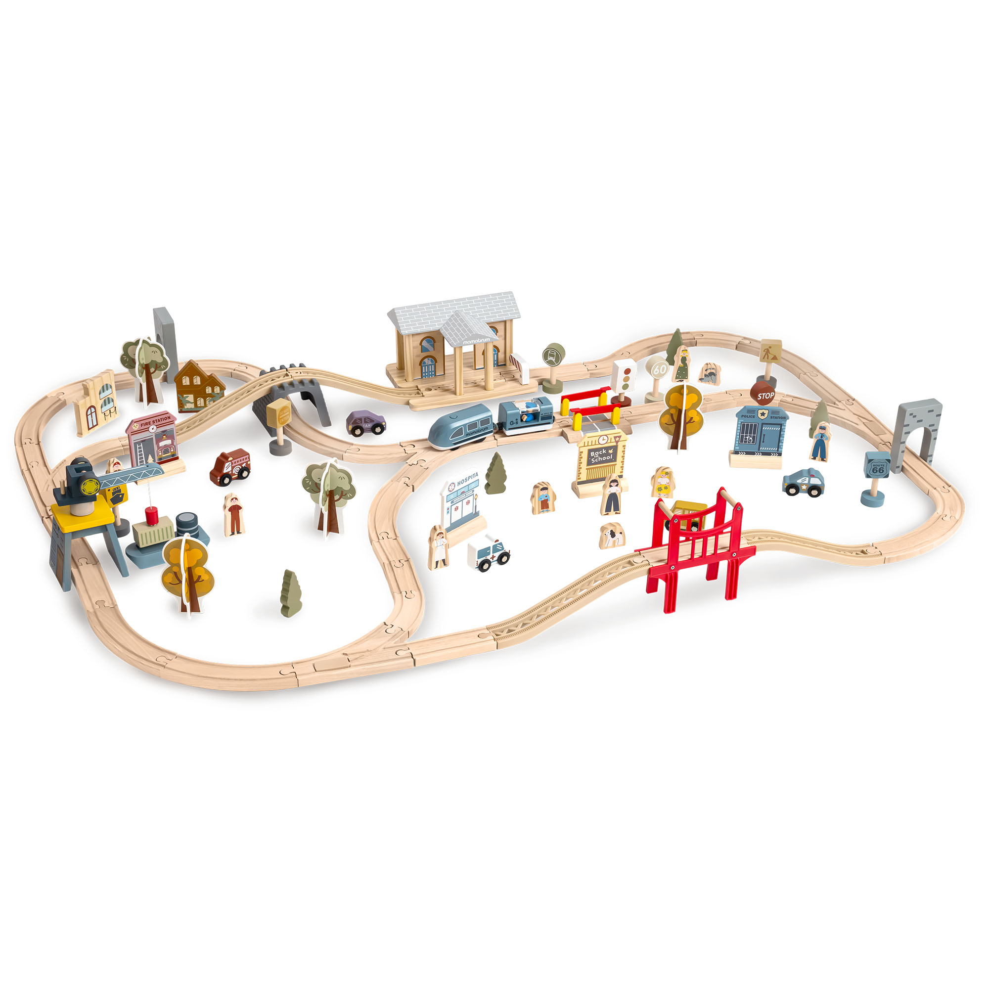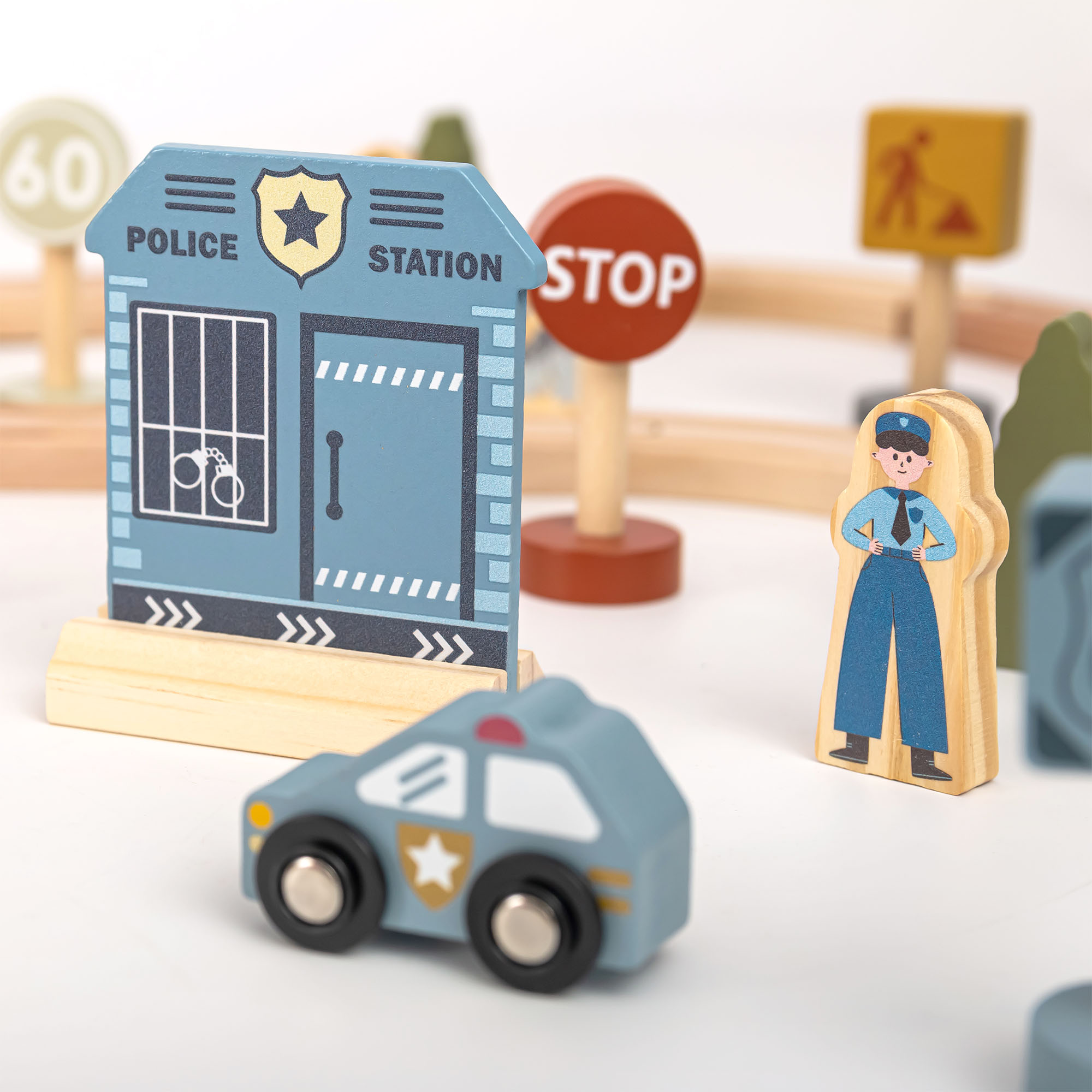 O conjunto inclui tudo o que é necessário para criar uma cidade movimentada: uma escola, um hospital, um quartel de bombeiros, uma delegacia de polícia , placas de trânsito, árvores e figuras de moradores. As crianças podem encenar cenas do dia a dia – resgatando, ensinando, patrulhando e dirigindo o trânsito. Brincar de cidade desenvolve empatia, compreensão dos papéis sociais e estimula a criatividade. Toda criança pode ser maquinista hoje e bombeiro ou médico amanhã.