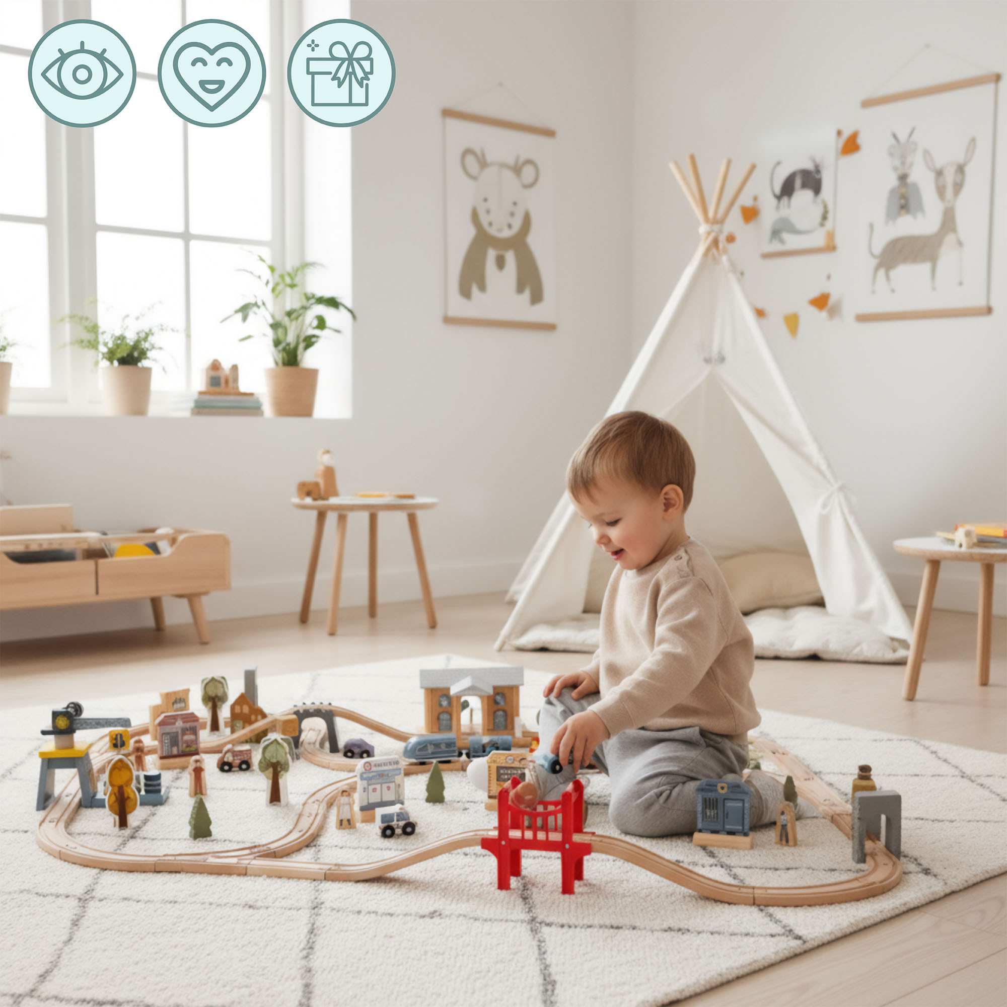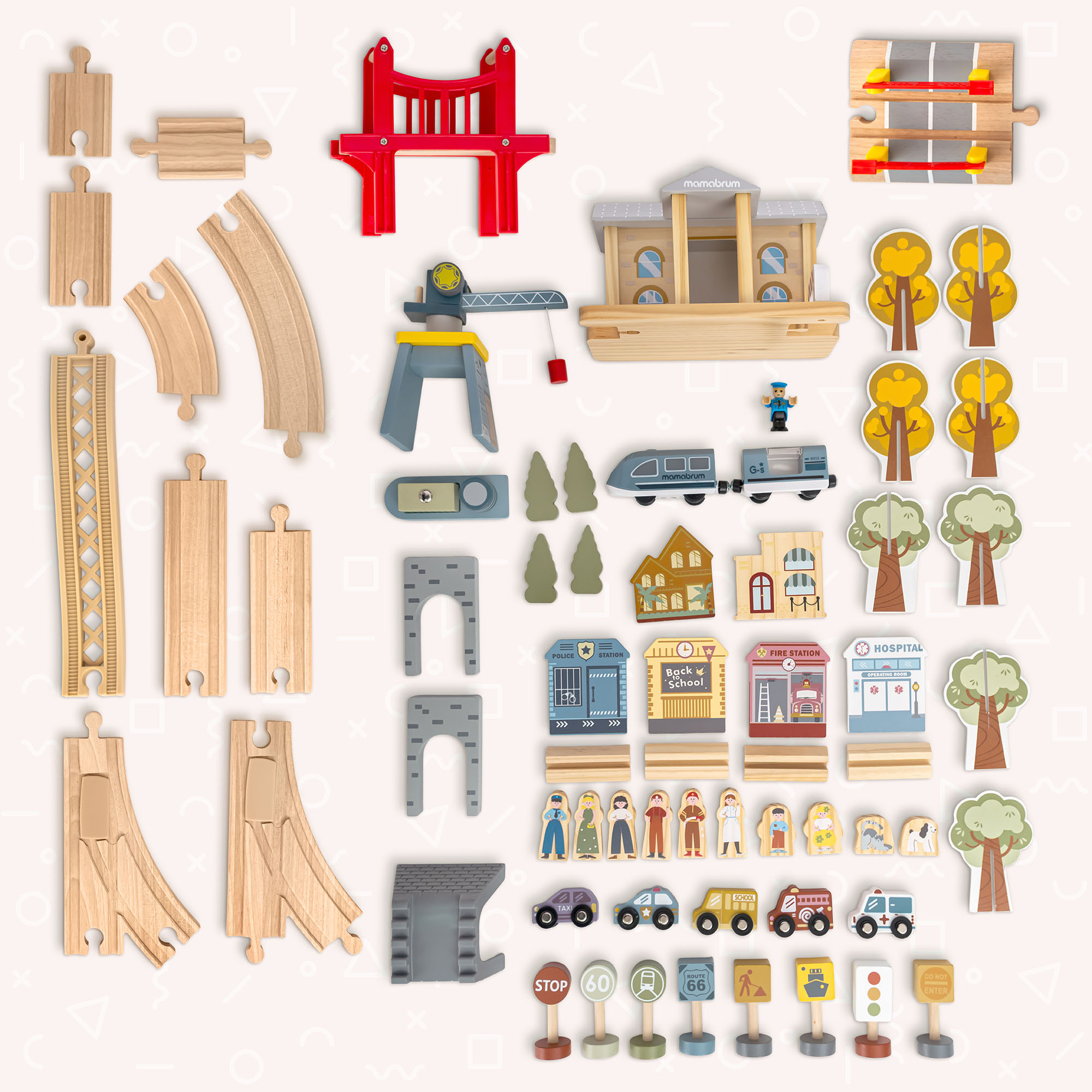 Transporte seu filho para uma cidade vibrante e cheia de aventuras! Este conjunto de trem urbano de madeira é completo e impressiona pela quantidade de peças, qualidade de fabricação e engenhosidade.