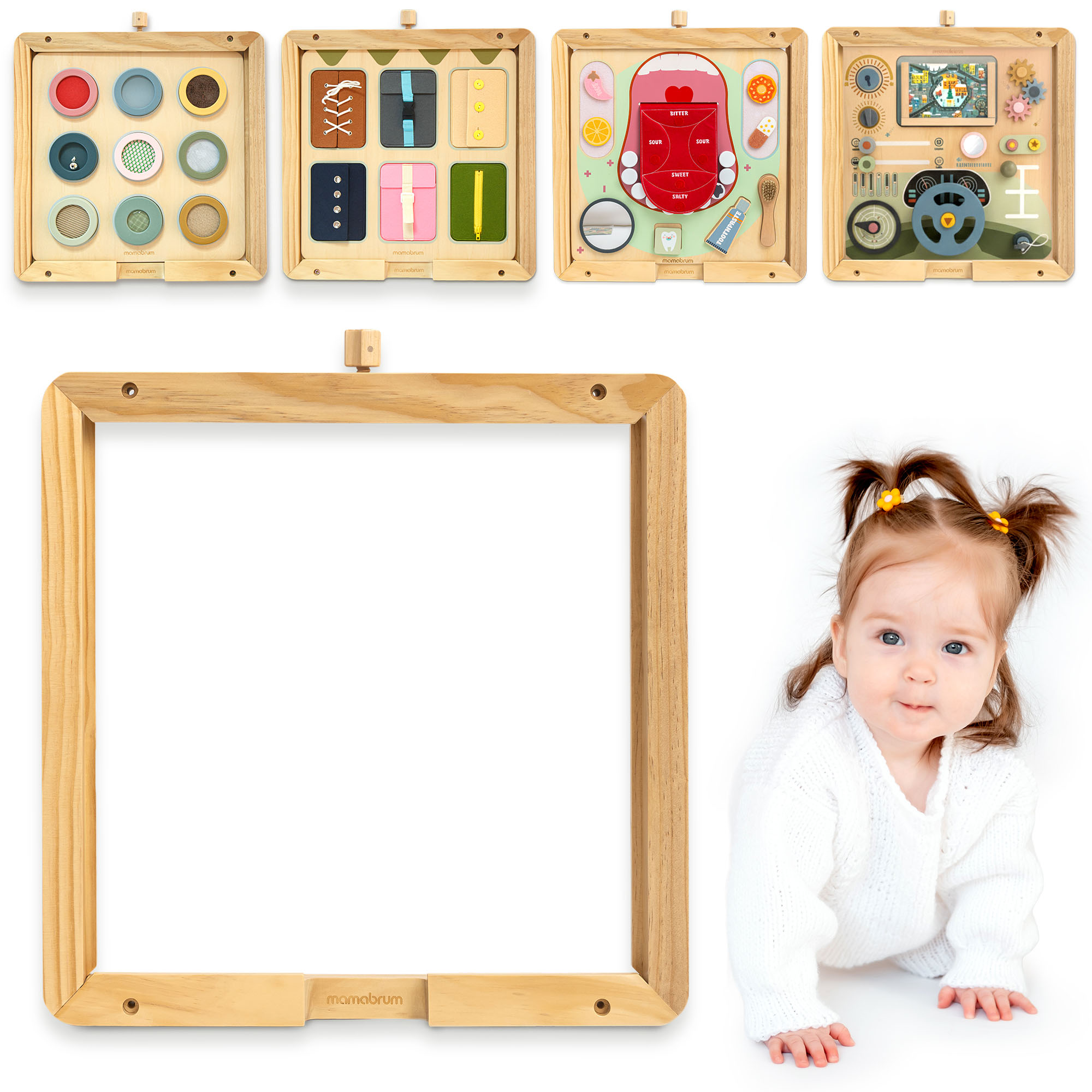 A moldura de madeira Mamabrum é um acessório prático e elegante que permite fixar facilmente o seu quadro educativo na parede. Ela transforma cada quadro Mamabrum em um ponto central estável, seguro e esteticamente agradável para as brincadeiras das crianças. Fabricada em madeira de pinho natural, a moldura impressiona pela sua durabilidade, solidez e belo acabamento. Esta solução combina funcionalidade, design e artesanato de alta qualidade.
