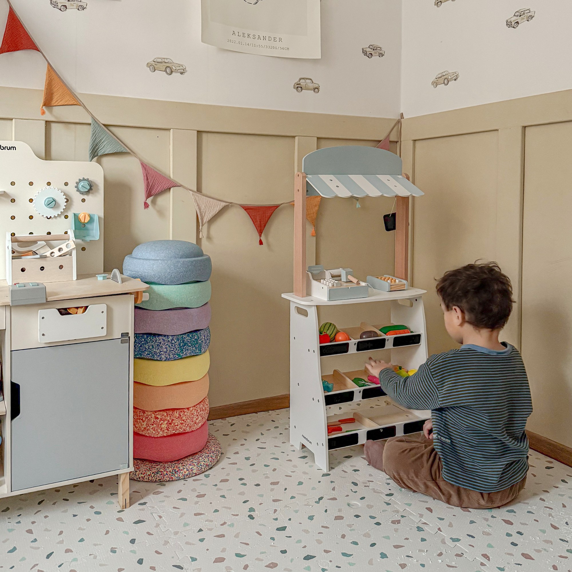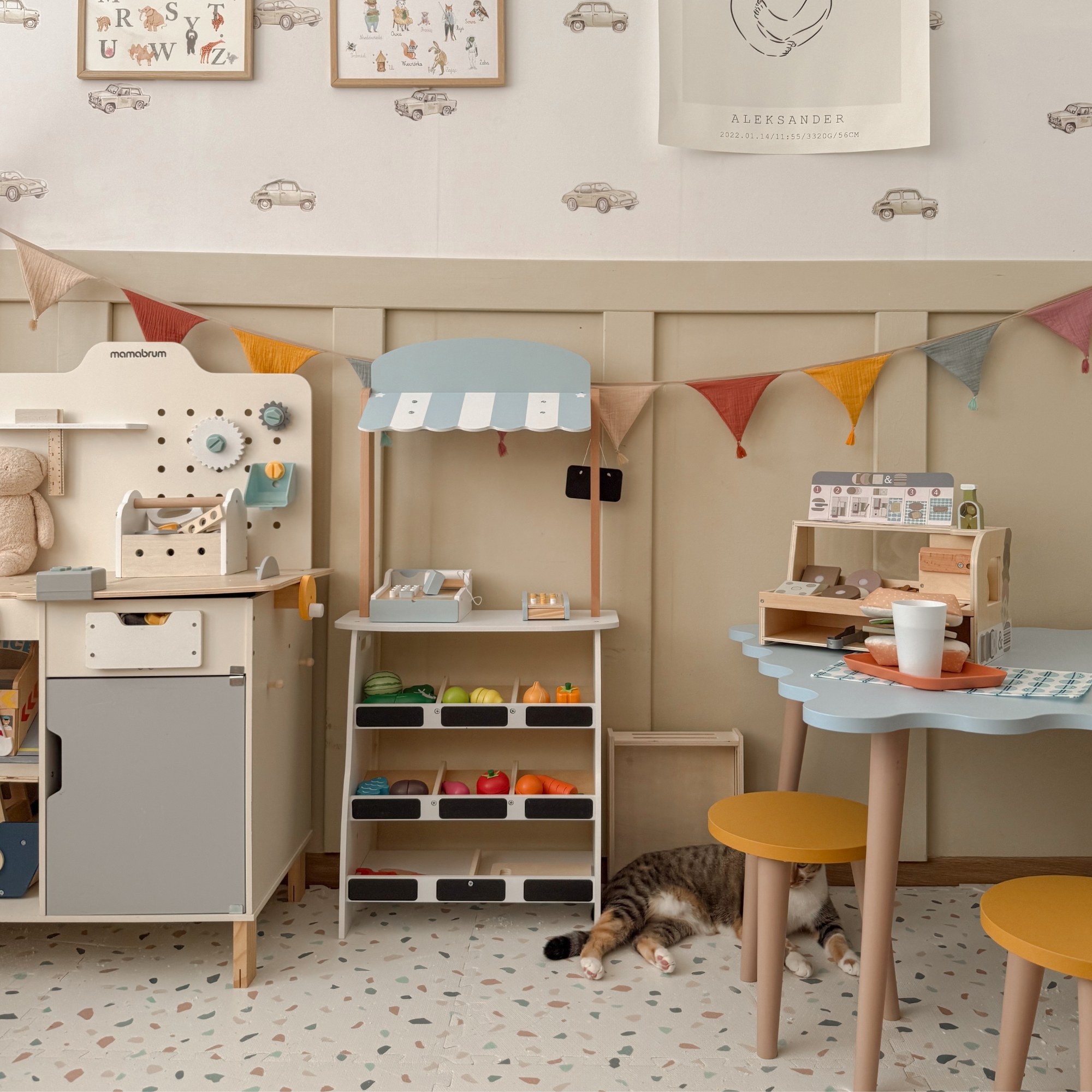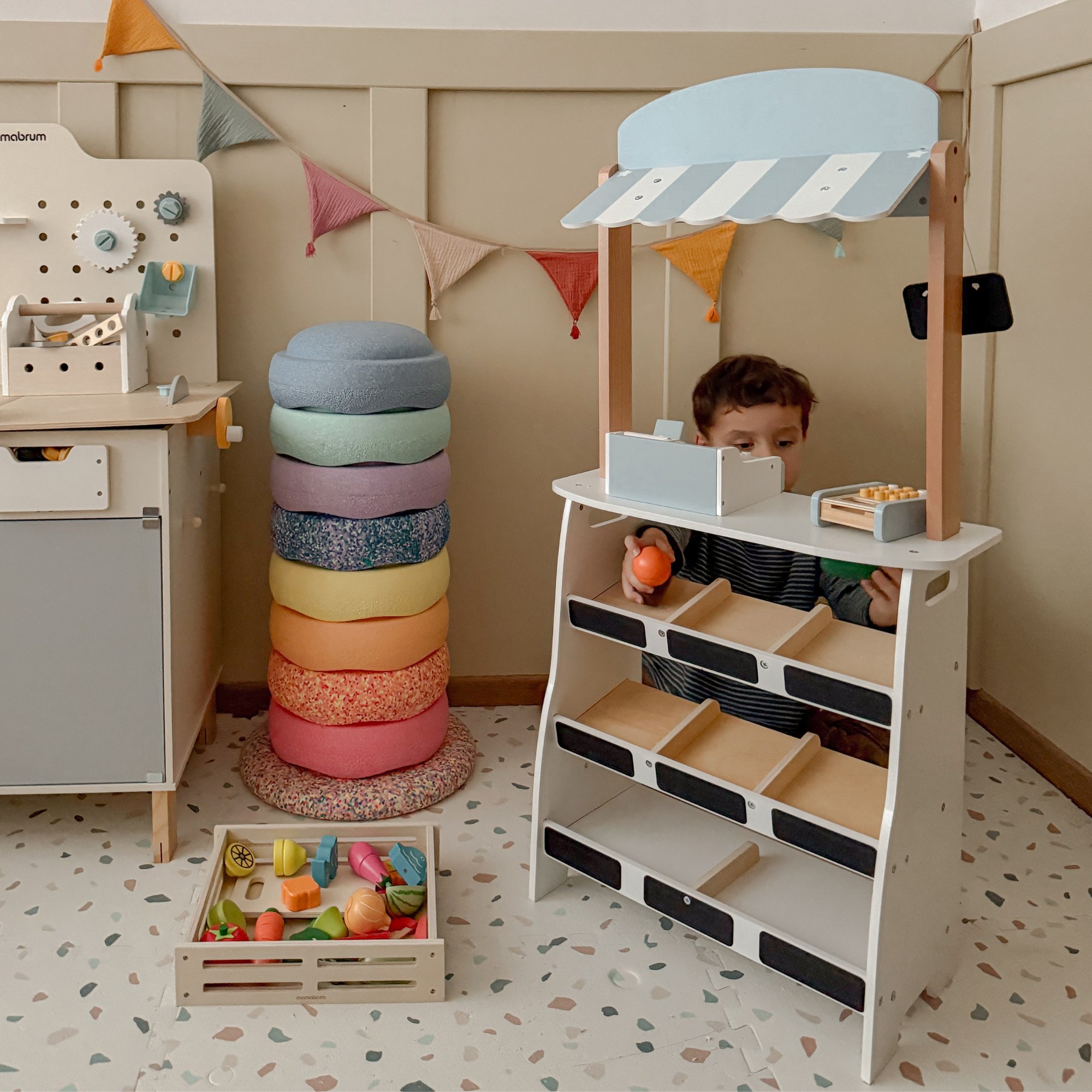 Na banca do mercado, em dia de mercado, você pode ouvir as pessoas dizendo que há um novo vendedor que tem um estoque saudável de vegetais! Aqui está um brinquedo que ajudará seu filho a aprender não apenas sobre negociação, mas também sobre alimentação saudável.