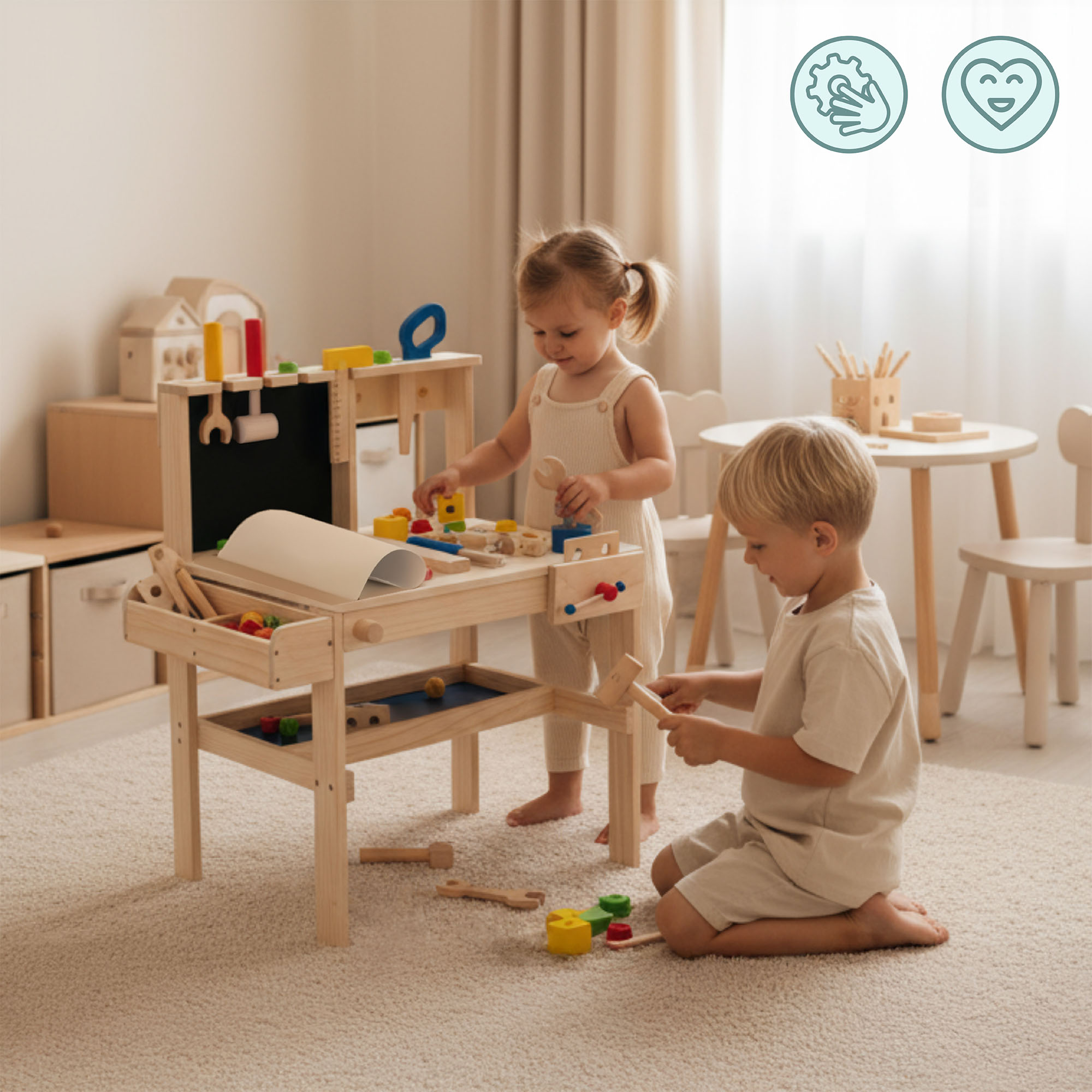100% seguro, sem arestas vivas, fabricado em madeira resistente, acessórios pintados com tintas ecológicas certificadas.
