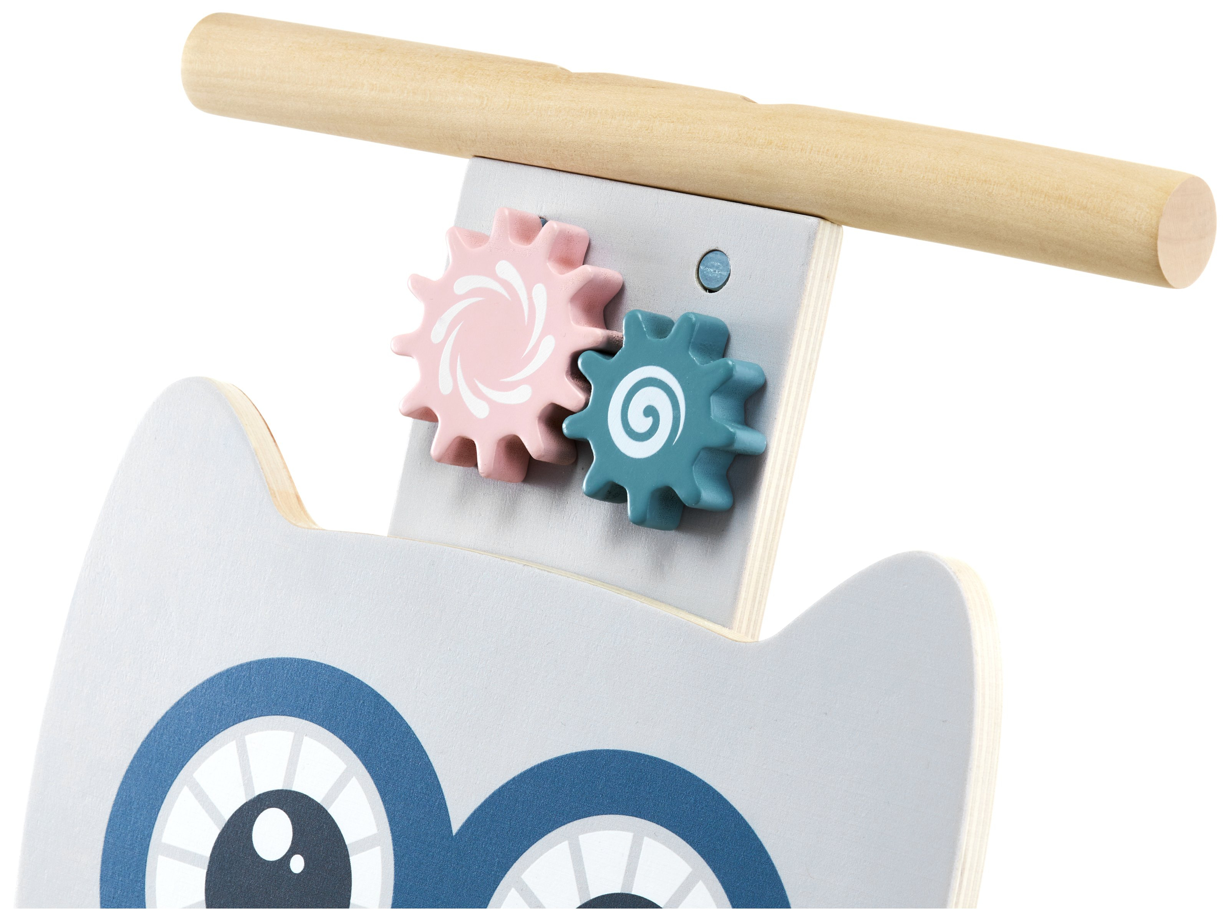 A coruja possui cabo de madeira, solidamente fixado à estrutura. Graças a isso, o bebê pode se movimentar com segurança. Há mais uma surpresa sob a alça - dois botões coloridos em forma de engrenagens que funcionam como os reais - um aciona o outro. Outro quebra-cabeça para o pequeno Explorador!