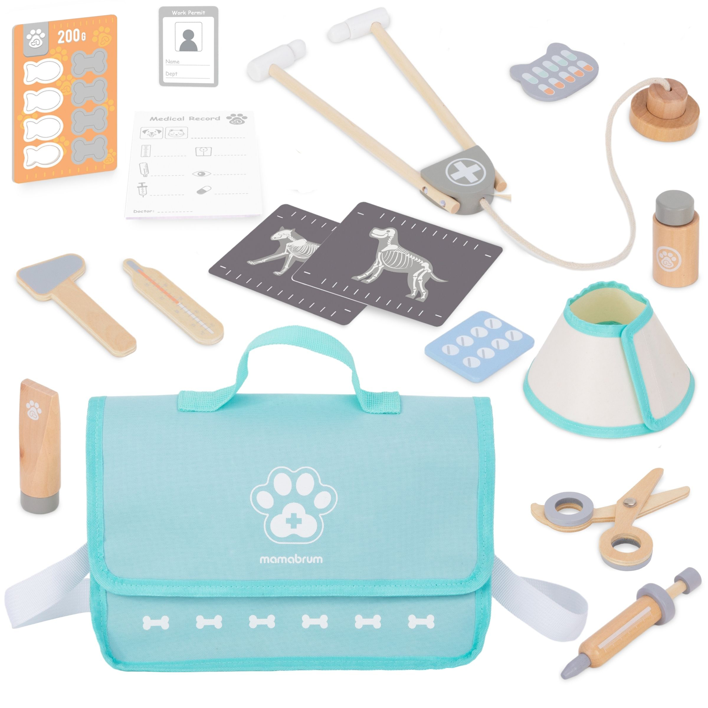 Um presente fantástico para os amantes de pequenos animais! Uma bolsa médica espaçosa com vários acessórios proporcionará muitas horas de entretenimento incrível e que estimula a imaginação. O conjunto veterinário de madeira permitirá que seu filho brinque com muitos cenários de brincadeira . Cuidar de amigos peludos e salvar suas vidas é um verdadeiro prazer e um sonho tornado realidade para muitas crianças. O conjunto com equipamentos ricos também apoia o aprendizado da empatia e da sensibilidade ao sofrimento dos outros.